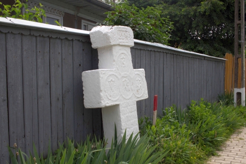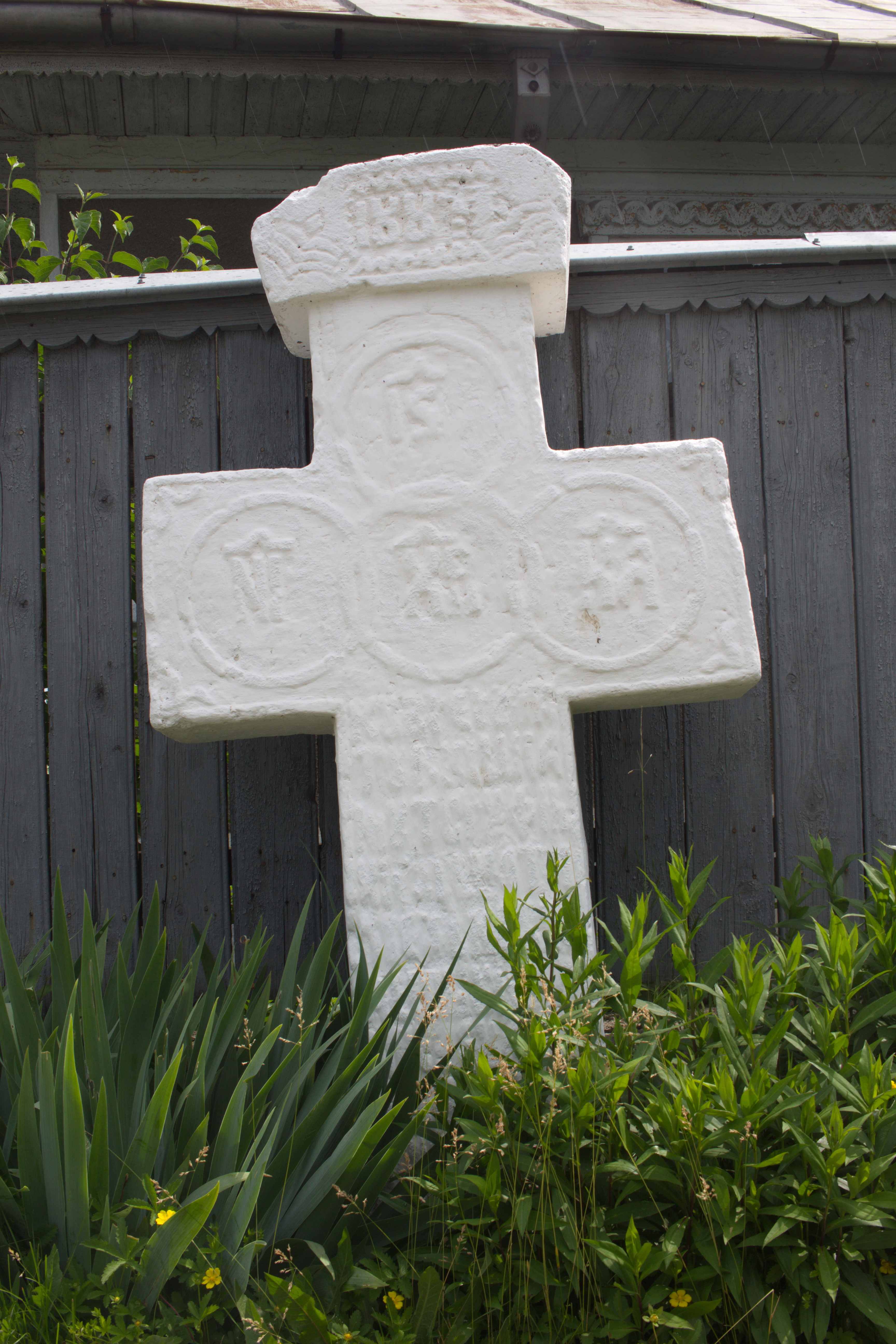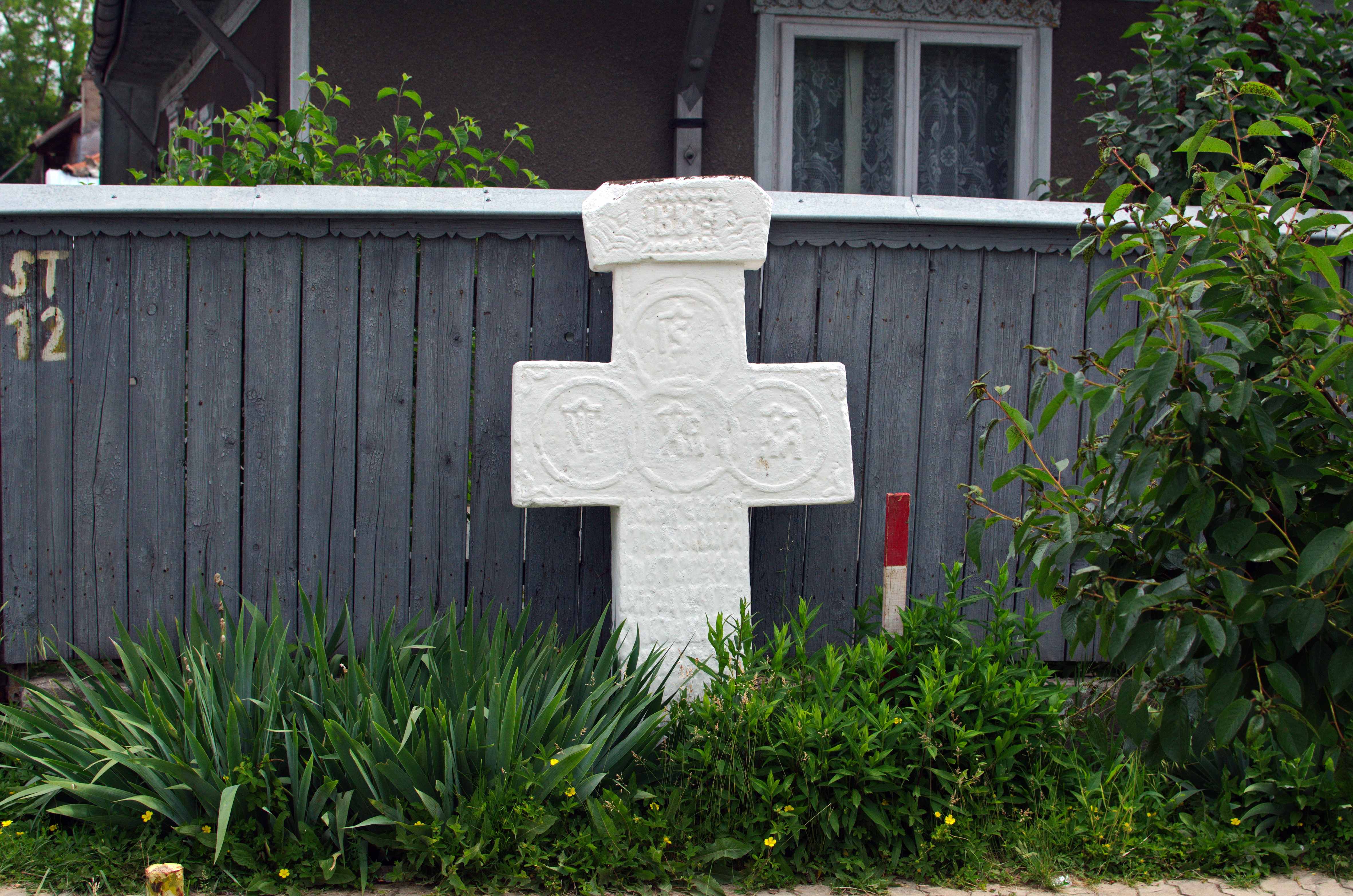 Descriere: Cruce de tip latin, văruită cu alb și se află cu fața la stradă, la aproximativ 40 cm de gardul unei gospodării. Capitelul crucii este decorat cu motive în valuri și motive geometrice, iar pe partea frontală este inscripționat anul 1887. Zona centrală a crucii este decorată cu patru medalioane circulare secante, cu linia centrelor formând un triunghi isoscel. Fiecare medalion are inscripționate în interior grupuri de caractere chirilice. Pe picior este inscripționat un text aproape indescifrabil, în caractere chirilice, dispus pe douăsprezece rânduri. Capitelul este spart în partea dreaptă superioară.