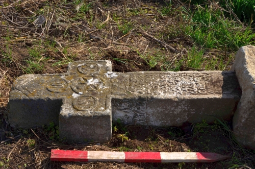 Descriere: Cruce de tip latin, fără capitel și prinsă într-un soclu masiv din piatră de formă dreptunghiulară. Este decorată cu patru medalioane. Trei medalioane circulare situate pe brațele transversale ale crucii sunt conexate cu medalionul central. Primul, „IC”, se află pe braţul stâng. În centrul crucii, între cele două braţe, se află medalionul central, decorat cu o rozetă. O altă inscripţie, „XC”, este încadrată într-un dreptunghi, aflat sub cele patru medalioane. Pe braţul stâng este un alt medalion având reprezentate în interiorul său literele „KA”. Pe braţul drept se găsește un medalion în interiorul căruia este scris „NИ”. Pe picior se desfășoară textul inscripției. Pe latura dreaptă a piciorului se observă urmele unui text ilizibil. Inscripțiile sunt redate cu caractere chirilice. Nu prezintă urme de pictură. Crucea prezintă urme de prelucrare, cu dalta sau altă unealtă. În momentul descoperirii a fost găsită culcată, fiind dărâmată cu scopul de a fi mutată.