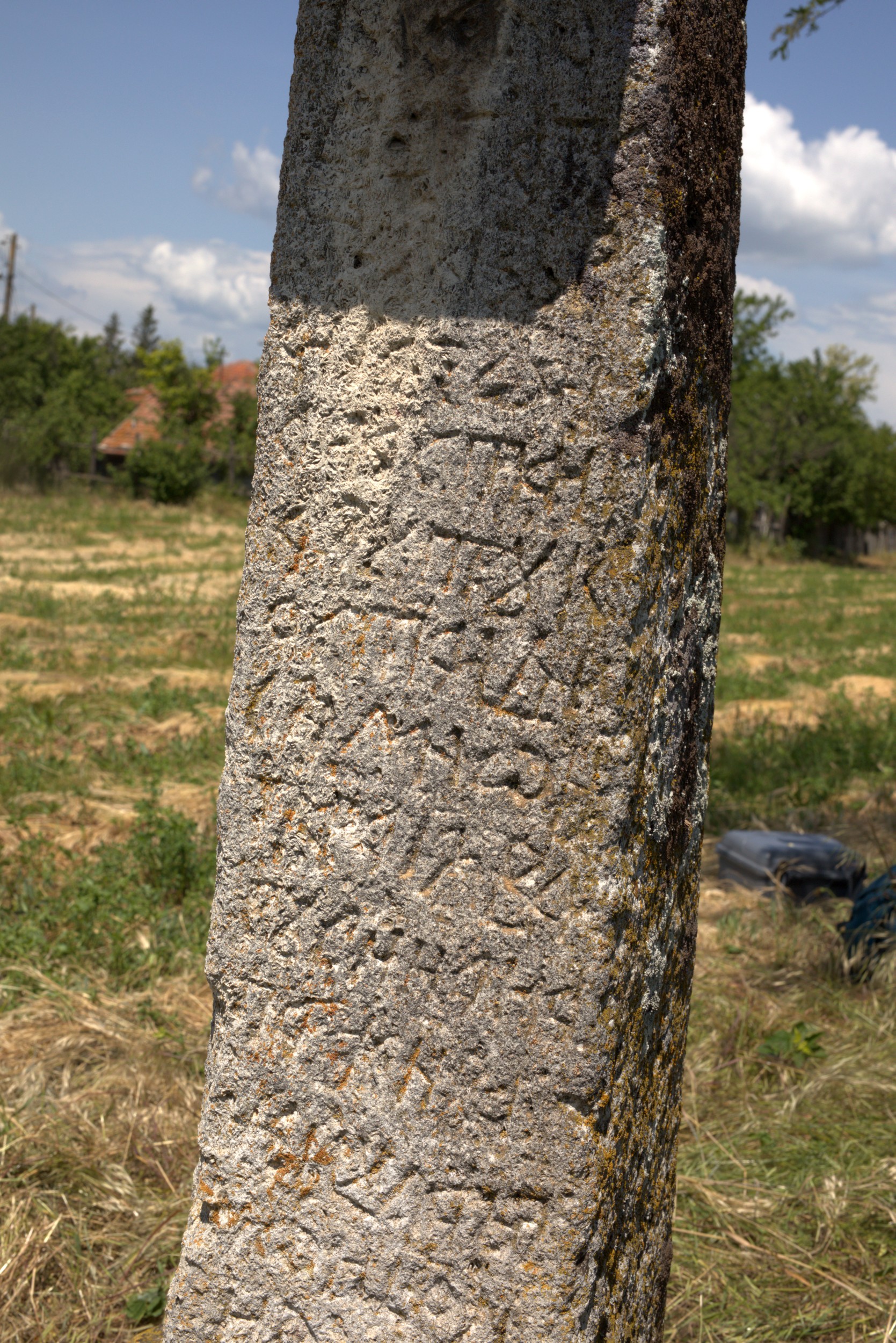 Inscripții: Inscripția de pe picior, din partea frontală este scrisă în limba română cu alfabet chirilic, pe 17 rânduri, cu lungimea de 24 cm (partea de sus) până la 28 de cm în partea de jos și litere cu înălțimea de 5 cm.
