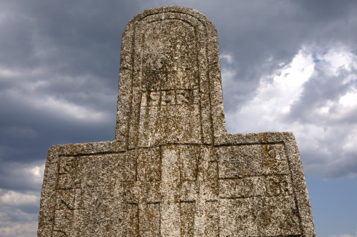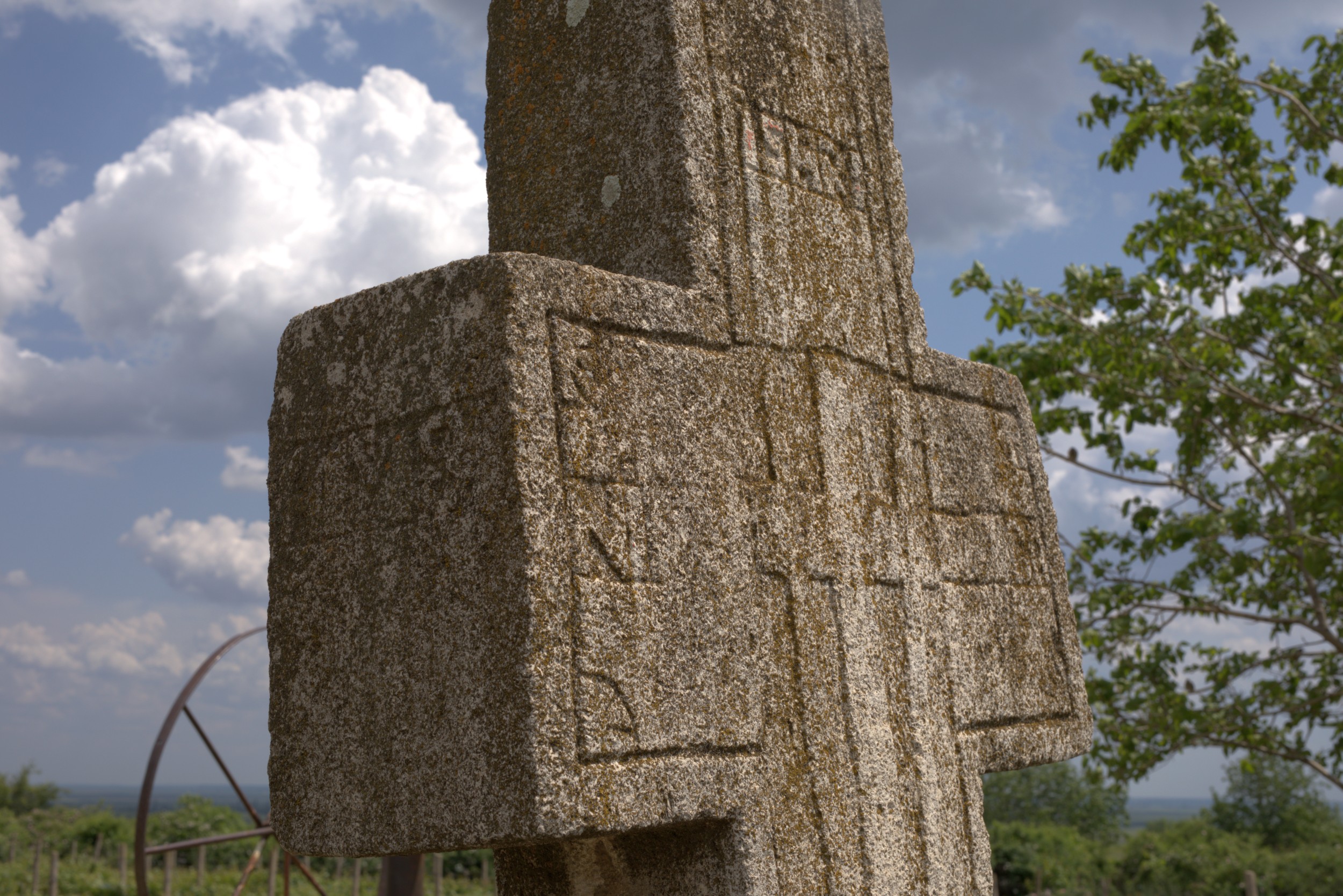 Descriere: Cruce de tip latin, de mari dimensiuni, fără capitel și cu bază paralelipipedică. Partea superioară a capului crucii este rotunjită. Monumentul este prins într-o bază sau piuă dreptunghiulară cu marginile neregulate, ce prezintă spărturi. Piciorul este cel mai lung element al crucii și prezintă o inscripție în limba română cu caractere latine. Inscripția frontală de pe picior este mărginită de un chenar care îngustează de la bază spre partea superioară. Textul amintește de familia care a ajutat la reparația crucii. Tot pe picior, pe partea din lateral dreapta mai prezintă o inscripție în latină care indică comanditarul, caracterele care indică numele acestuia fiind din păcate aproape ilizibile. Muchia stângă și spatele nu prezintă decor. La îmbinarea brațelor prezintă un decor incizat ce înfățișează un grup de trei cruci care stau pe o bază semisferică. Decorul incizat se continuă și în partea superioară a piciorului fiind mărginit de chenarul inscripției care se continuă și în zona brațelor și a capului. Brațele sunt decorate cu două inscripții ce alcătuiesc monograma „NI” (brațul drept) și „CA” (brațul stâng). Cele patru colțuri ale chenarului care decorează brațele prezintă rozete. Capul se continuă cu chenarul care se rotunjește în partea superioară. Prezintă inscripție cu monograma „ISHR”.
