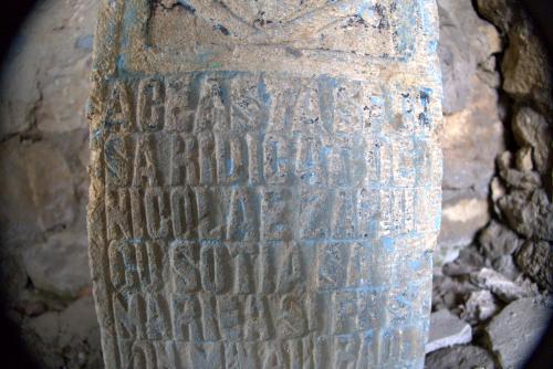 Inscripții: Inscripție frontală de pe cruce este scrisă în limba română cu alfabet latin, pe 9 rânduri (vizibile), cu lungimea de 25 cm și litere cu înălțimea de 6 cm. Piciorul crucii este parțial îngropat așa că nu se poate/pot vedea ultimul/ultimele rânduri ale inscripției.