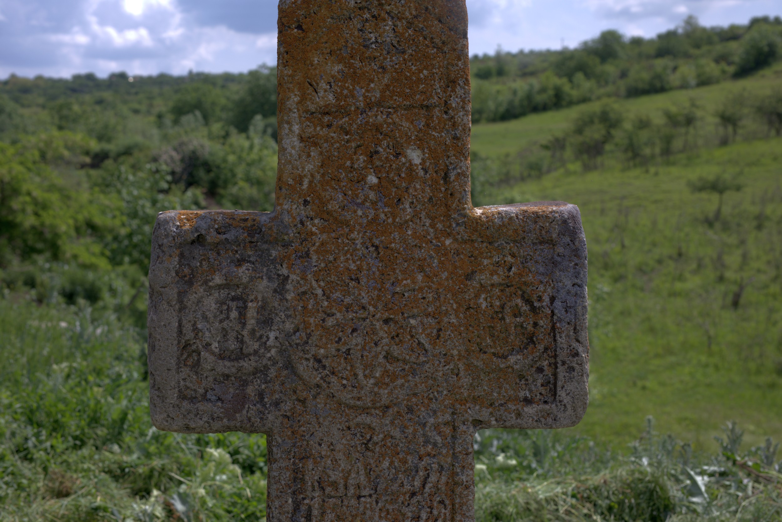 Descriere: Cruce latină de dimensiuni medii spre mici, fără capitel, prinsă într-un soclu de mici dimensiuni, dispus pe sol. Decorația frontală este afectată de mușchi și licheni fiind aproape ilizibilă. Cuprinde patru medalioane. Un medalion se află pe capul crucii și încadreaza monograma IC. Medalionul central este mai mare comparativ cu cele trei și încadrează un motiv floral sau o rozetă. Pe brațul drept medalionul încadrează monograma ИH (NI) iar pe brațul stâng este un medalion ce încadrează monograma KA (CA). Pe picior este monograma XS care de această dată nu mai este încadrată de un medalion. Pe picior este inscripționată apoi o dedicație scrisă în limba română cu alfabet chirilic. Și pe laterale prezintă inscripții, respectiv în partea stângă, prezină urmele unei inscripții șterse pe muchia brațului stâng, precum și pe picior, precum și pe picior, pe partea dreaptă. Inscripțiile sunt scrise în limba română cu alfabet chirilic iar rândurile sunt marcate prin linii orizontale incizate. Pe spatele crucii nu se văd urme de decor sau de inscripții. Crucea este prinsă întru soclu relativ rotund, care prezintă două cavițăți de prindere, unul în spate și altul în față. Crucea pare să fi fost prinsă în acest soclu cu ciment în anul 1960.