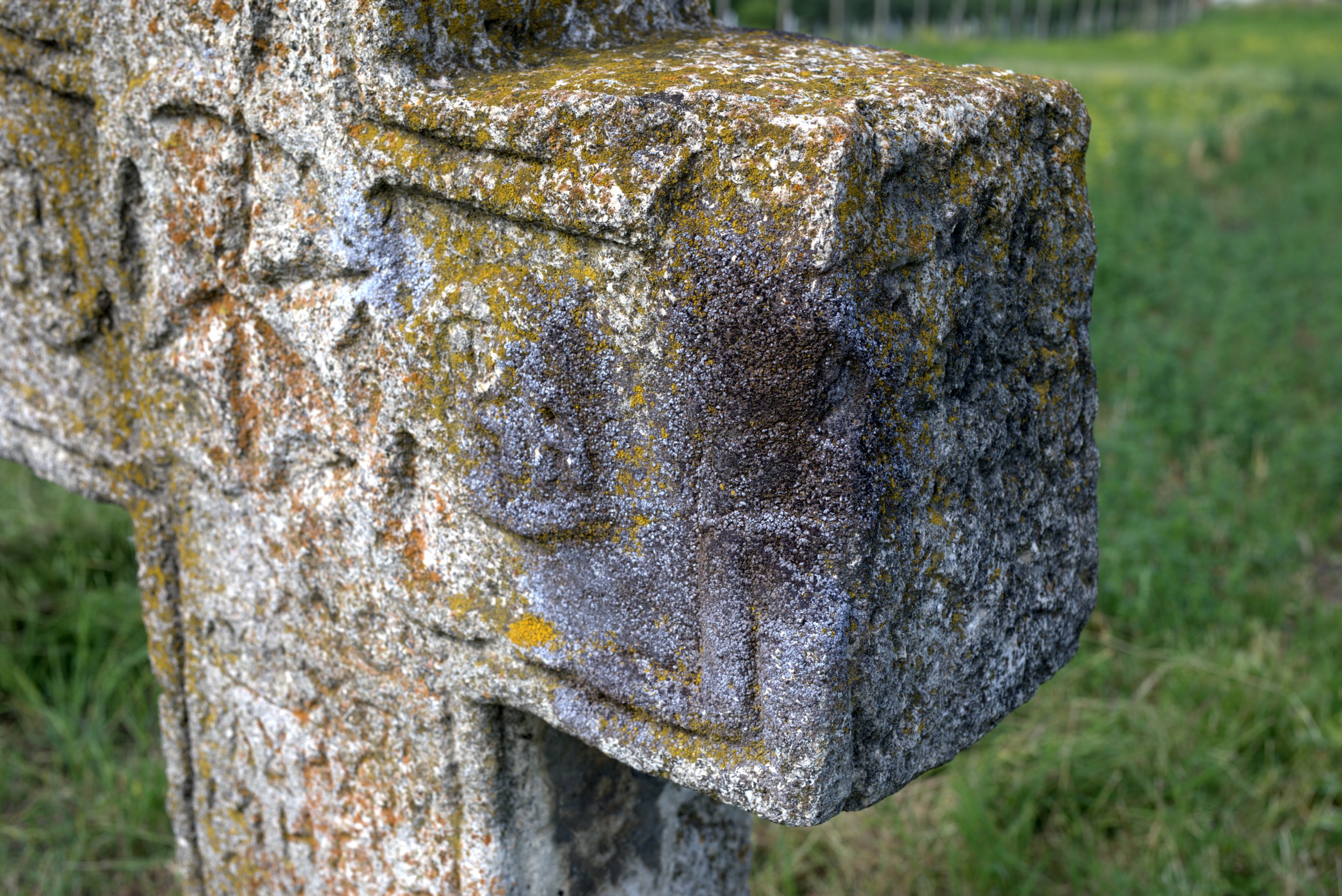 Descriere: Cruce latină, de dimensiuni medii, fără capitel prinsă într-un soclu (piuă) îngropată. În partea frontală este decorată cu patru medalioane dispuse pe cap, be brațe și la intersecția brațelor precum și o inscripție dispusă pe picior. Pe cap este un medalion ce încadrează monograma IC. Pe brațul drept este o monogramă ce încadrează monograma NI iar pe brațul stâng este un medalion ce încadrează monograma KA. Medalionul central este de mai mari dimensiuni și încadrează o rozetă sau un simbol solar. Inscripția de pe picior este scrisă în limba română cu alfabet de tranziție. Pe fața laterală, în partea stângă, crucea este inscripționată pe muchia brațului și pe picior. De asemenea, mai este inscripționată și fața lateral dreapta a crucii, pe muchia brațului și pe picior. Spatele crucii nu prezintă decor sau inscripție.
