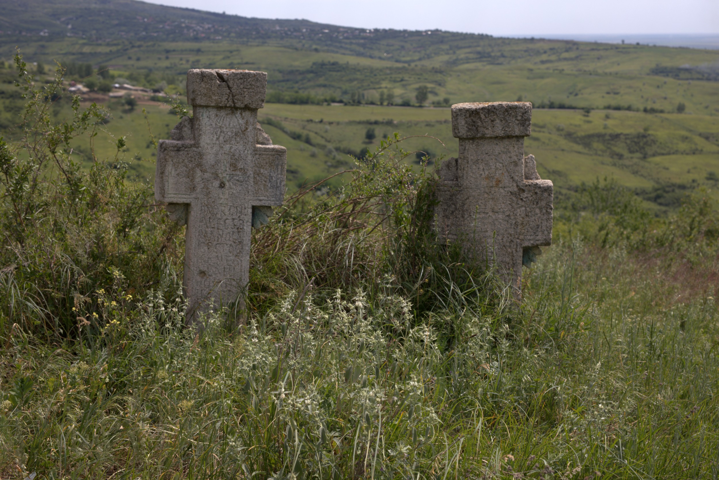 Descriere: Cruce latină cu aripioare, de mici dimensiuni, cu capitel fixă și prinsă într-un soclu aproape pătrat, în mare parte îngropat. Capitelul este dreptunghiular, spart pe jumătate și inscripționat în partea frontală. Aripioarele prezintă raze incizate care sugerează motivul crucii radiante. Pe aripioare se observă urme de pigment albastru care sugerează că această cruce a fost pictată. Pe capul crucii este decorat o semirozetă inscripționată. Decorația centrală este reprezentată de simbolul crucii cu urme de pigmenți care sugerează ca a fost și pictată. Pe picior prezintă un text scris în limba română cu alfabet latin. Pe laterale și pe spate nu mai prezintă urme de elemente decorative și inscripții.