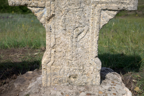 Descriere: Cruce celtică parțial distrusă. Partea superioară a fost pierdută dar cel mai probabil ar fi avut un capitel care acum este dispărut. S-a pierdut și capul crucii. S-au mai păstrat corpul format din îmbinarea brațelor, piciorul de mici dimensiuni și bucăți din soclul. Crucea a fost reamplasată cu un material din piatră betonată turnat peste soclul original. Lângă cruce este un fragment din picior, probabil piciorul crucii, care conține o inscripție în limba română cu alfabet latin. Decorația frontală este reprezentată de scena Răstignirii lui Iisus, relief aflat într-o stare avansată de degradare. Pe brațe sunt inscripționate monogramele hristice NI KA și H S. Soclul este mai lat decât piciorul și s-a păstrat pe bucăți. Soclul atașat crucii prezintă o incripție cu bordură, pe două rânduri, scrisă în limba română. Pe fețele laterale nu prezintă nici inscripție și nici decorație. Pe spatele crucii este reprezentat un relief cu Maica Domnului, șters aproape complet. Pe brațe se văd urmele monogramele M și D. Și pe picior se văd urmele unei inscripții.