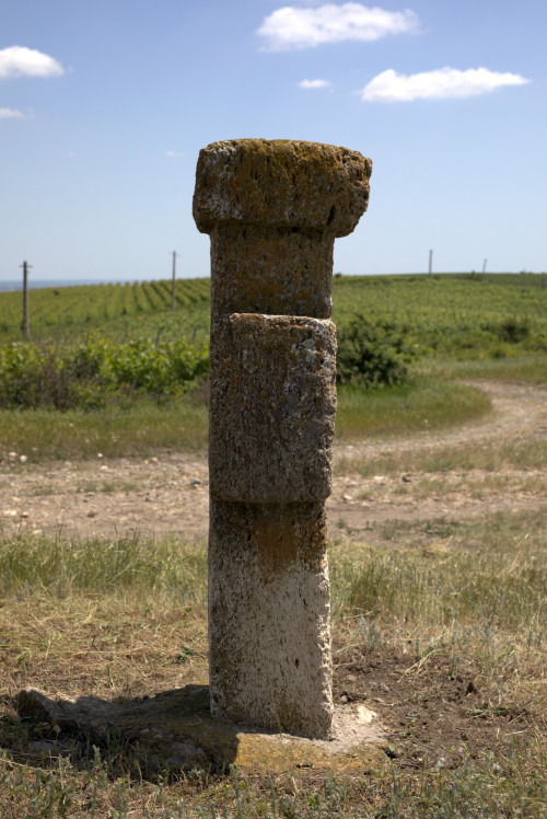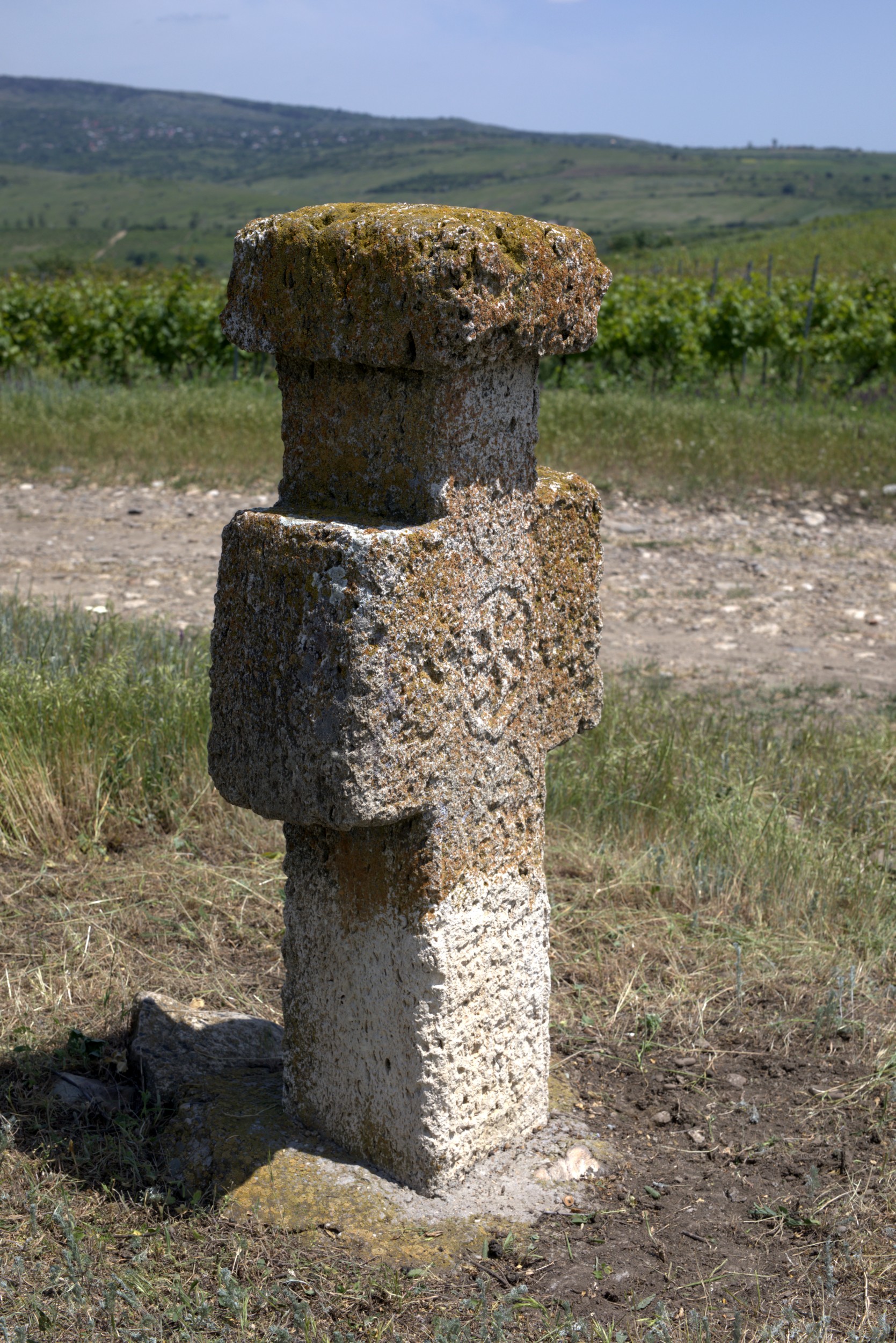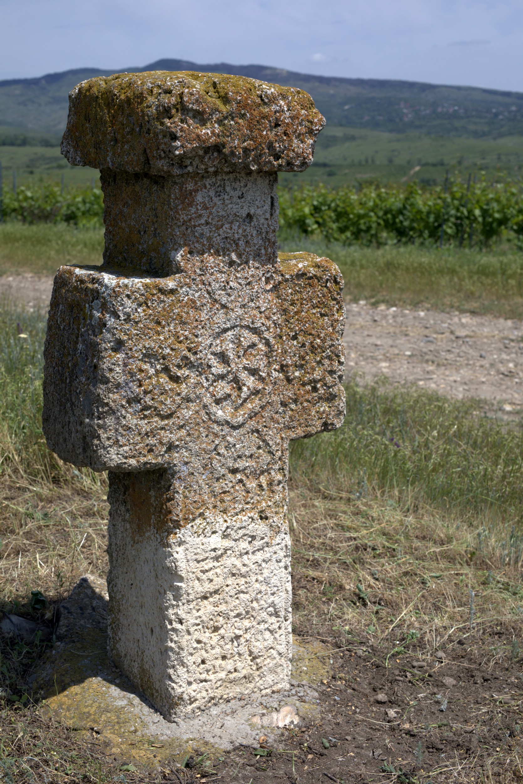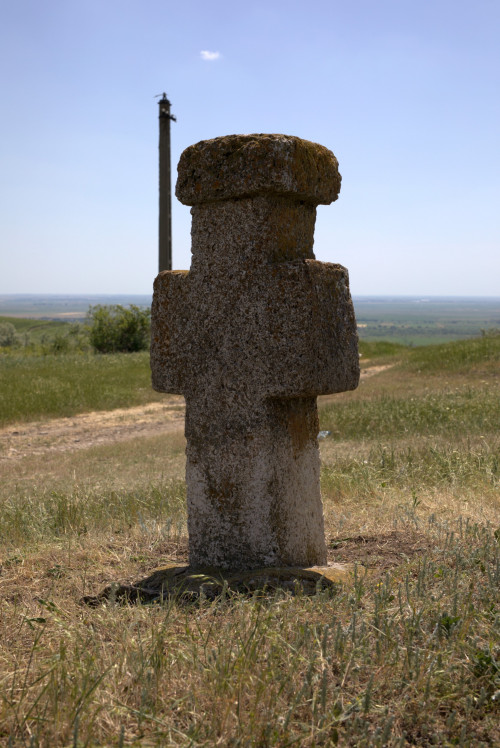Descriere: Cruce latină, de mici dimensiuni, cu capitel și prinsă într-o bază dreptunghiulară. Capitelul este dreptunghiular, într-o stare precară și nu se poate spune dacă prezenta decor. Crucea se află într-o stare precară inscripțiile find distruse iar decorația abia se mai poate vedea. În partea frontală, orientată spre conac, este decorată cu 5 medalione dispuse pe cap, pe brațe în partea mediană și pe picior. Se mai vede medalionul central, mai mare decât celelalte patru și care încadrează o rozetă. Celelalte medalioane sunt aproape șterse și nu se mai vede ce încadrau. Cel mai probabil încadrau monogramele hristice. Pe picior, în partea frontală și în partea stângă sunt urme care ar sugera existența unei inscripții, acum distrusă. Piciorul și baza crucii au fost refăcute, baza fiind din ciment.