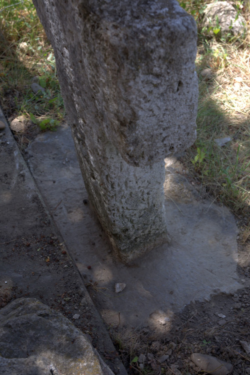 Stare de conservare: Starea de conservare este medie spre precară. Pictura este dispărută iar inscripția este aproape ștearsă pe toate fețele. Este serios afectat de eroziune, într-o măsură medie de murdăria ancrasantă, de mușchi/licheni și spărturi și într-o măsură foarte mică de fisuri. Crucea a fost prinsă într-o placă de beton care i-a acoperit ultimele rânduri ale inscripției. A fost și văruită iar acest lucru a afectat integritatea calcarului din care este realizată dar și inscripția și decorația.