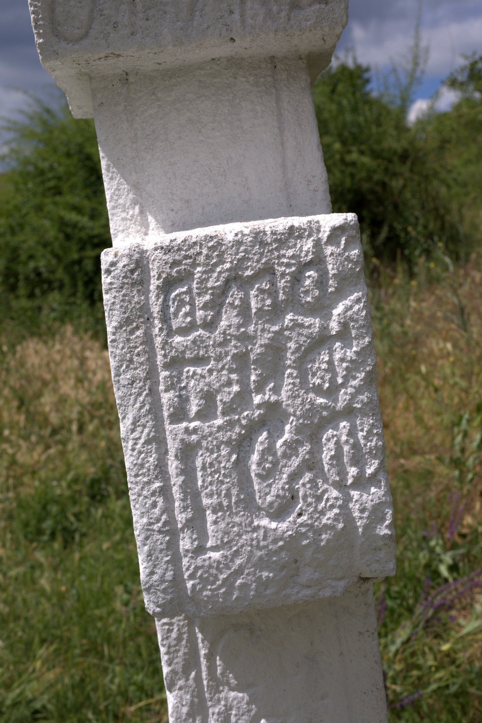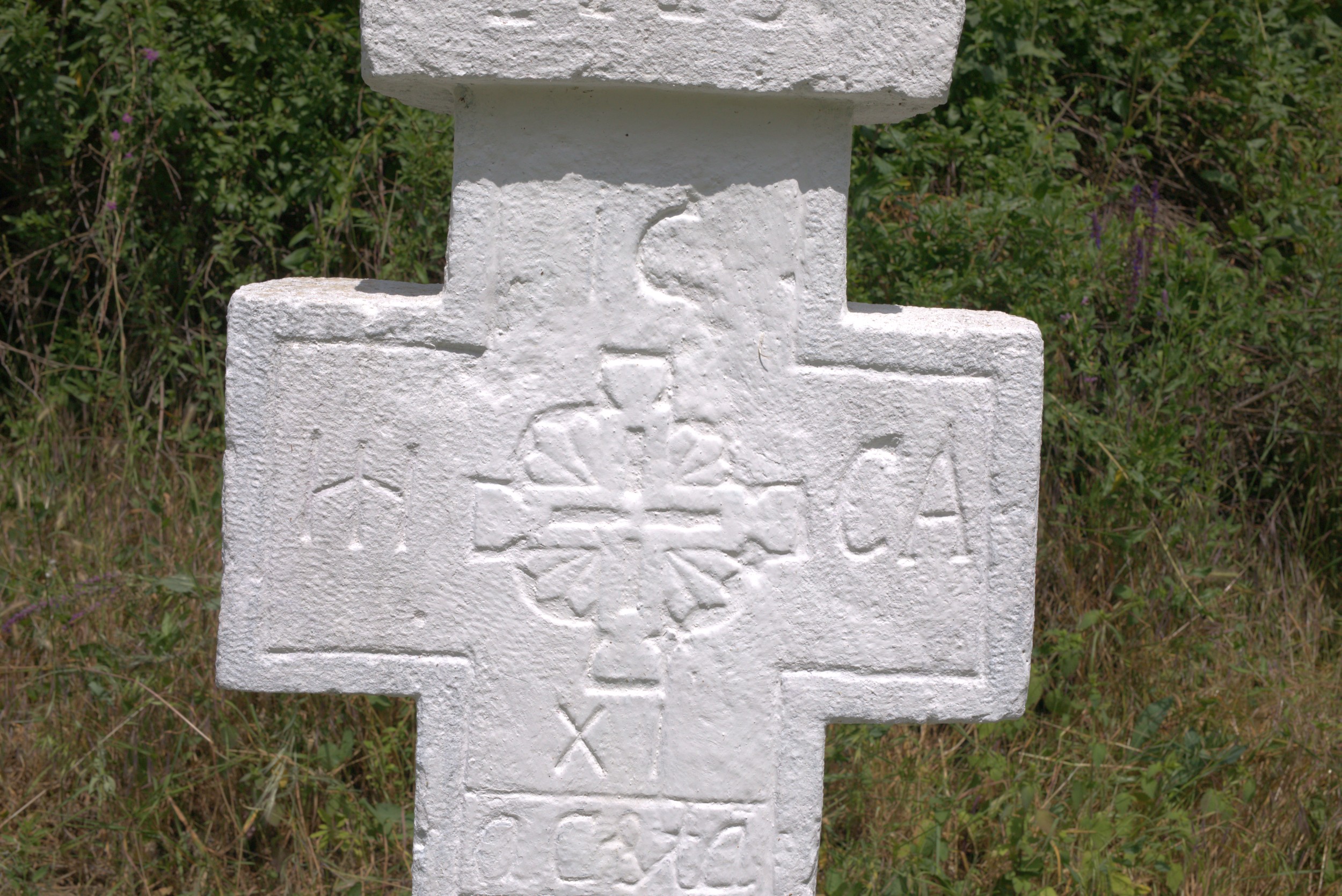 Inscripții: Inscripția frontală este scrisă în limba română cu alfabet latin, pe opt rânduri, cu lungimea de cca 18 cm și înălțimea literelor de cca 6 cm. Inscripția de pe capitel, în partea stângă este scrisă în limba română cu alfabet latin, pe un rând, cu lungimea de cca 19 cm și litere cu înălțimea de 5 cm. Inscripția de pe muchia brațului stâng este scrisă în limba romănă cu caractere latine, pe 3 rânduri, cu lungimea de 13 cm și înălțimea literelor de cca 5 cm. Inscripția de pe capitel, de pe spatele crucii este scrisă în limba română, cu alfabet latin, pe un rând cu lungimea de 28 cm și litere cu înălțimea de 8 cm. Inscripția de pe piciorul crucii, în spate este scrisă în limba română cu alfabet latin, pe șase rânduri, cu lungimea de 18 cm și litere cu înălțimea de cca 8 cm. Pe partea dreaptă a crucii, pe capitel este inscripționat un text în limba română cu caractere latine, pe două rânduri, cu lungimea de 19 cm și litere cu înălțimea de cca 8-5 cm. Pe muchia brațului drept este scris un text în limba română cu alfabet latin, pe trei rânduri, cu lungimea de cca 13 cm și litere cu înălțimea de 5 cm. Pe picior este o inscripție în limba română, pe 10 rânduri, cu lungimea de 13 cm și litere cu înălțimea de cca 5 cm.