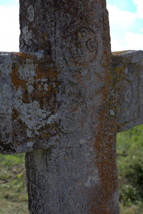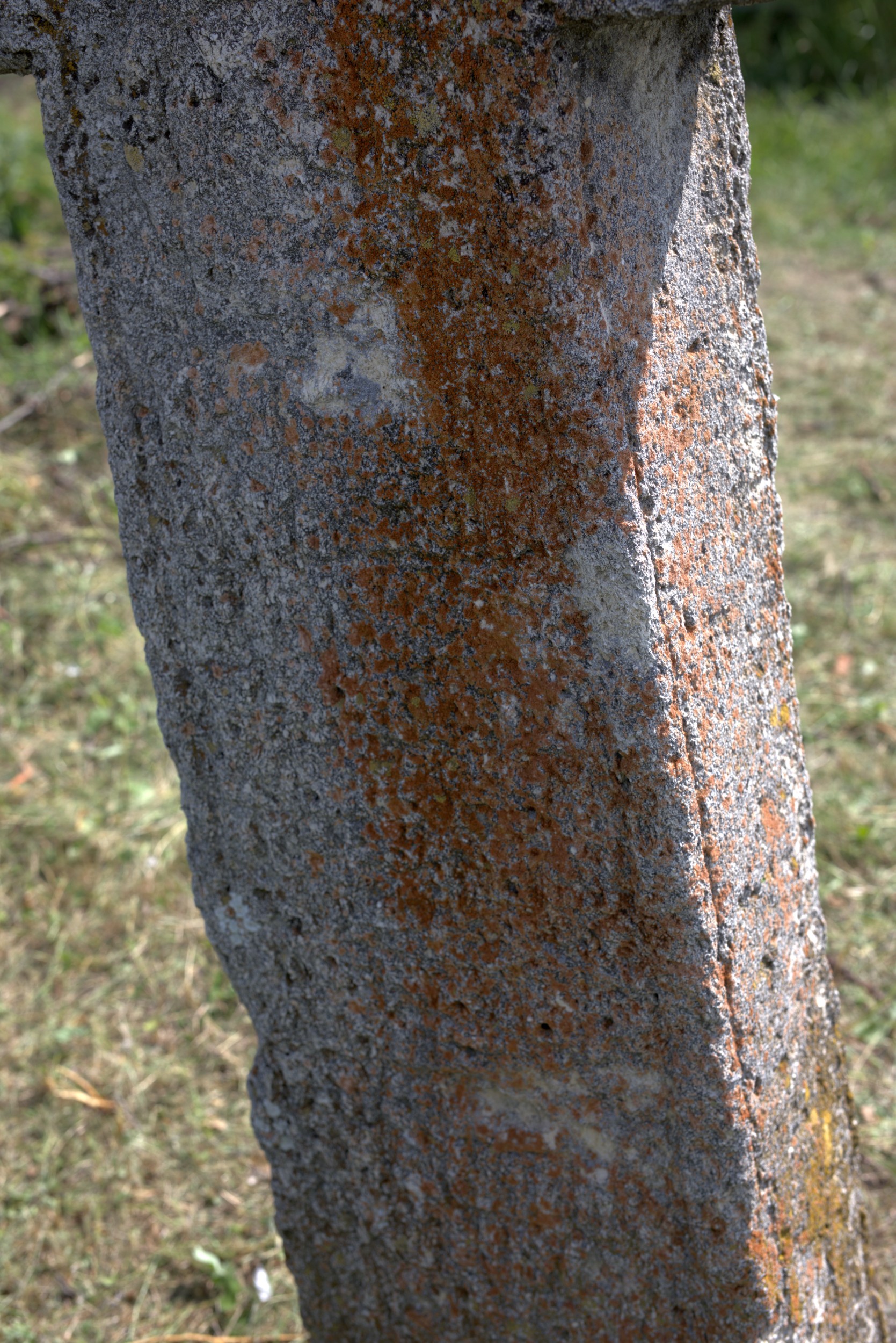 Descriere: Cruce latină, de mari dimensiuni, fără capitel, prinsă într-o bază pătrată. În partea frontală este decorat cu patru medalioane dispuse pe capul crucii, brațele crucii și pe partea superioară a piciorului crucii. Medalionul de pe capul crucii cuprinde monograma IC. Medalionul central este de dimensiuni mai mari decât celelale, fiind dispus în partea mediană a brațelor crucii. Medalionul încadreză o rozetă. Medalioanele de pe brațul crucii cuprind monogramele NI KA. Decorația și medalioanele sunt aproape distruse de eroziune și de murdăria ancrasantă. Pe picior este o inscripție ilizibilă. Și pe partea dreaptă a piciorului crucii este o inscripție aproape ilizibilă. Baza este pătrată și pe jumătate îngropată.