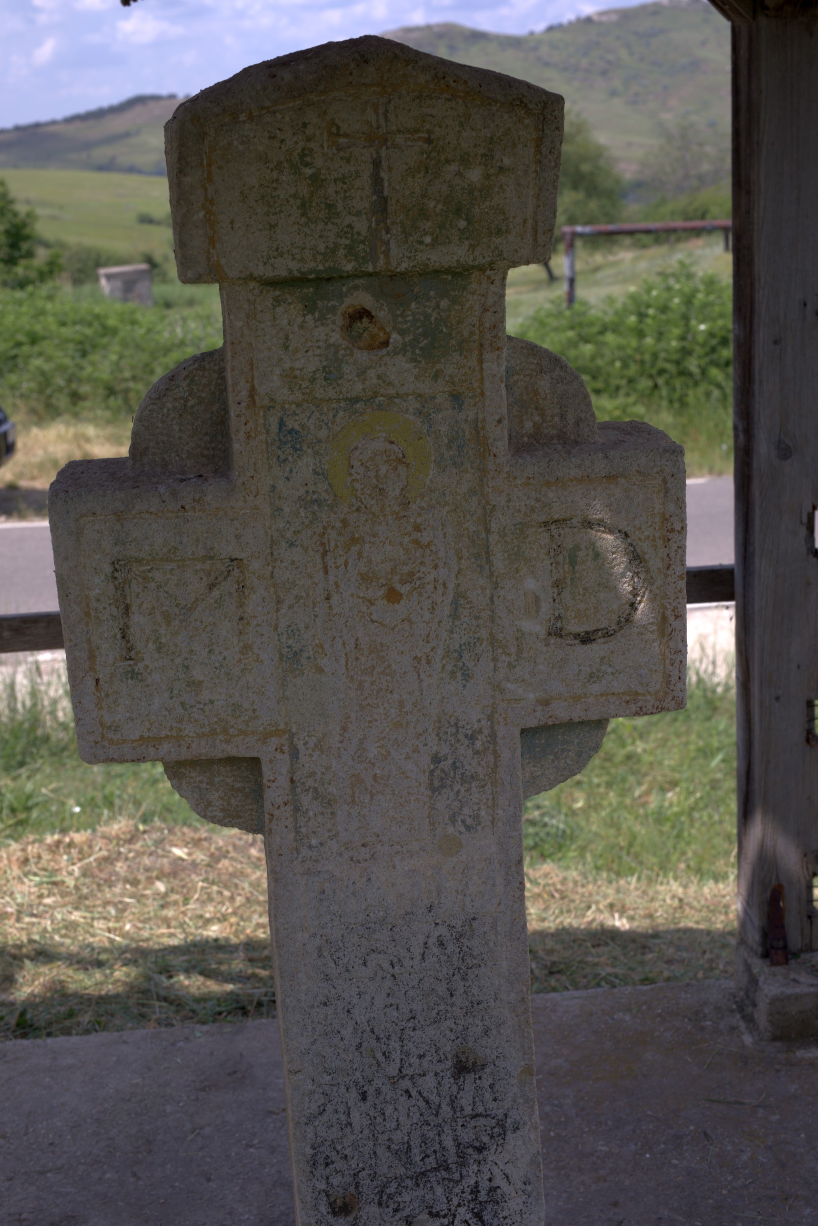 Descriere: Cruce celtică, de dimensiuni medii, cu aripioare, cu capitel și prinsă într-o bază de ciment. Face parte dintr-un ansamblu de două cruci, fiind cea mai înaltă. Crucile sunt protejate de un foișor din lemn cu acoperiș în patru ape, din țiglă. Căciula (capitelul) crucii are formă de trunchi de piramidă și este decorat atât pe față, cât și pe spate. În partea frontală, îndreptată spre drum, prezintă o inscripție care datează anul ctitoririi, respectiv anul 1937, cu o cruce inscripționată în partea stângă. Pe spate este decorată cu o cruce inscripționată și un sfânt reprezentat la dreapta. Sunt urme evidente de vopsea atât pe partea frontală cât și pe spatele capitelului, fiind decorată cu o pictură în galben și verde. Crucea este decorată și inscripționată pe toate fețele. În partea frontală este decorată cu scena Răstignirii lui Iisus. Reprezentarea lui Iisus este redată în relief. Veșmintele, nimbul, crucea și fundalul au fost cel mai probabil pictate. Se mai păstrează urme dintr-o pictură policromatică cu galben, verde, albastru, negru. Deasupra capului lui Iisus sunt monogramele în relief IS HS iar pe brațele drept și stâng al crucii sunt monogramele în relief NI și CA. Scena Răstignirii este cuprinsă atât pe capul, pe brațele și pe partea superioară a piciorului crucii. Sub scenă, pe jumătatea inferioară a piciorului este o inscripție cu dedicația crucii, scrisă în limba română cu alfabet latin. O mică parte din picior este prinsă în placa de beton și ultimele rânduri ale inscripției nu pot fi citite. Aripioarele crucii nu sunt decorate deși este posibil să fi fost pictată. Sunt urmele unei vopsele în negru pe toate cele patru aripioare. Pe partea stângă, pe picior, se observă urmele unui text pictat în negru. Pe spate este reprezentată Maica Domnului redată în relief și pictată cu galben, verde și albastru. Decorul este plasat în partea mediană a crucii, între cap, brațele crucii și partea superioară a piciorului și este încadrat într-un chenar în relief. De-o parte și de alta a brațelor sunt inscripționate litele M, pe brațul stâng și D, pe brațul drept. Sunt reprezentarea Maicii Domnului este o inscripție în limba română, cu multe litere șterse și cu urme de vopsea neagră. Pe partea dreaptă, pe picior sunt urmele unei inscripții.