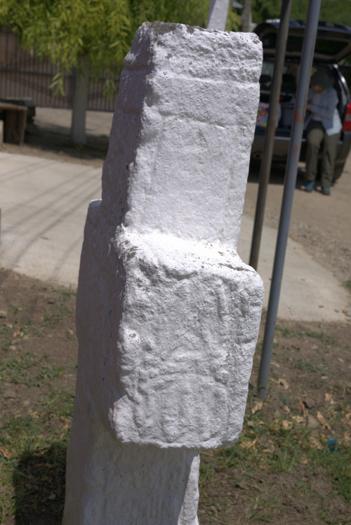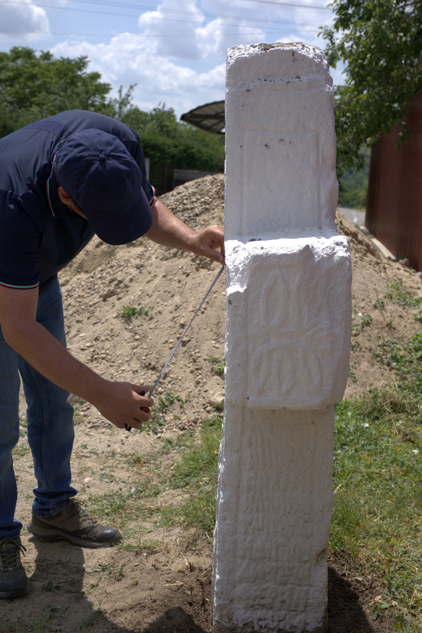 Inscripții: Inscripția frontală a fost scrisă în limba română cu alfabet latin, pe 10 rânduri (câte se observă deasupra solului), pe lungimea de 23 de cm și cu litere cu înălțimea de 4 cm. Inscripția de pe picior, lateral dreapta, a fost scrisă în limba română cu alfabet latin, pe 11 rânduri (câte se observă deasupra solului), pe lungimea de 17 de cm și cu litere cu înălțimea de 4 cm. Inscripția de pe picior, lateral dreapta, a fost scrisă în limba română cu alfabet latin, pe 9 rânduri (câte se observă deasupra solului), pe lungimea de 17 de cm și cu litere cu înălțimea de 4 cm.
