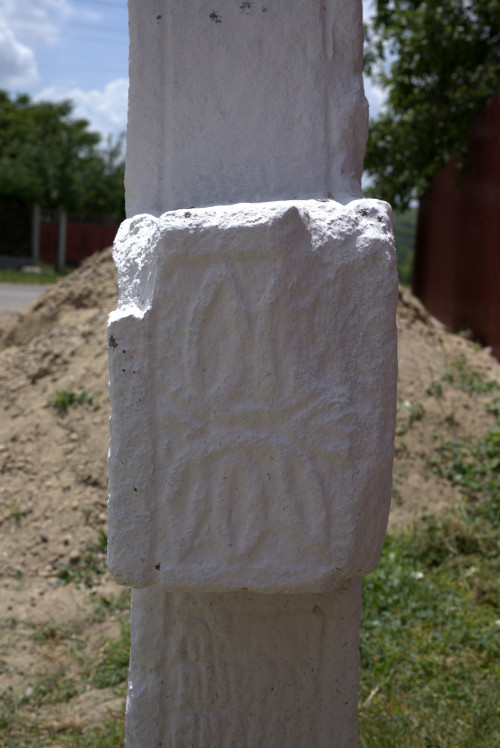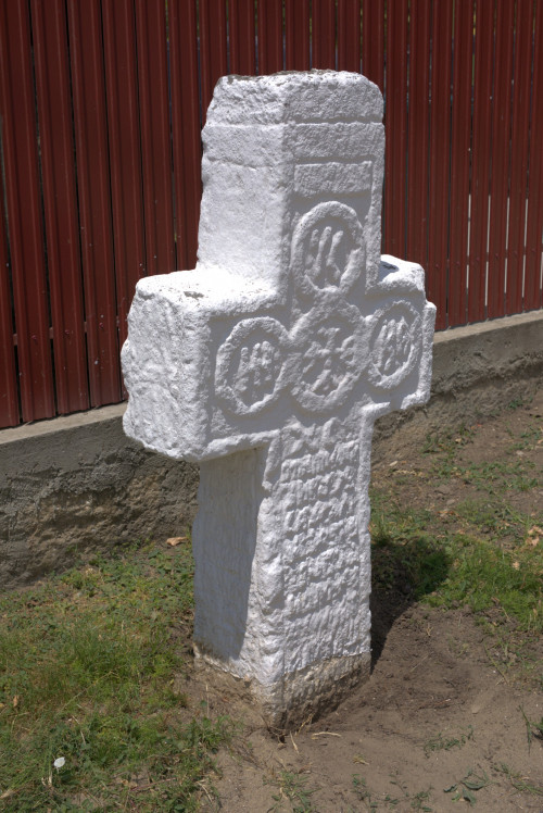 Descriere: Cruce de tip latin, de mici dimensiuni, fără capitel, decorată cu rozete sculptate. Crucea este decorată pe toate fețele. Pe față este prezintă patru medalioane în relief. Medalionul de pe cap încadrează monograma IC. Brațele crucii prezintă trei medalioane care încadrează monogramele NI și KA, puse pe brațul drept și stâng. Medalionul central încadrează o cruce. Pe partea superioară a piciorului crucii este monograma XC. Pe picior urmează apoi o inscripție aproape ilizibilă, care pare a fi scrisă în limba română în alfabet latin. Pe spate decorația este aproape ștearsă complet și acoperită de var Pe spate se observă un chenar cu lățimea de 25 cm care nu pare să fi încadrat o inscripție. Muchiile brațelor crucii sunt decorat cu motive florale în relief. Atât partea dreaptă cât și partea stângă a piciorului crucii sunt inscripționate cu texte în limba română cu alfabet latin, aproape ilizibile. O parte a piciorului crucii și baza sunt îngropate. Crucea a fost văruită și atât inscripția, precum și decorația și chiar piatra din care a fost realizată crucea au fost afectate de var.