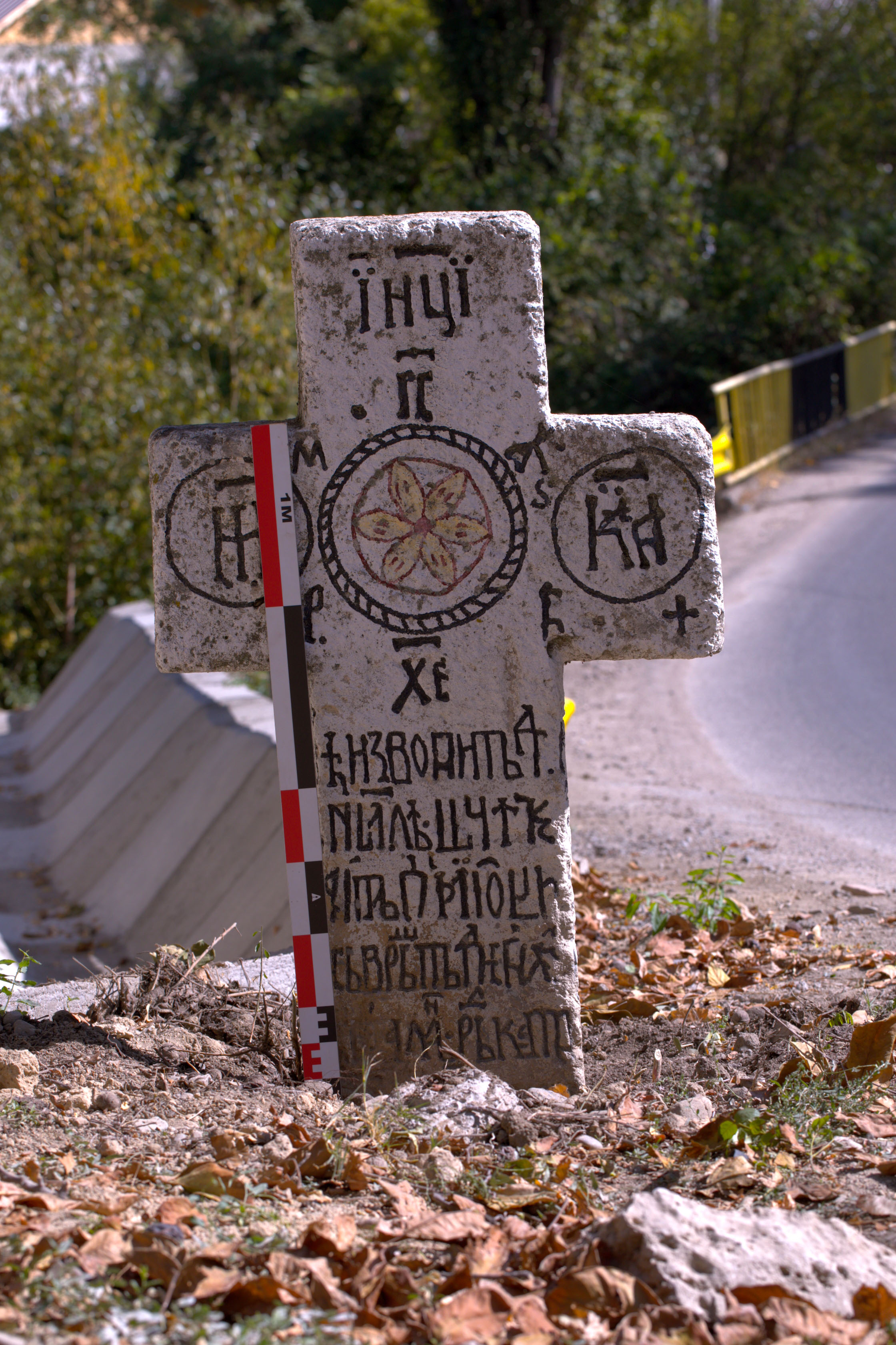 Inscripții: Inscripție frontală, scrisă în limba română cu caractere slavone, pe 6 rânduri, cu o lungime a rândului de 29 de cm și litere cu o înălțime de 7,5 cm. Inscripția de pe picior, partea dreaptă este scrisă în limba română cu caractere slavone, pe 6 rânduri, cu lungimea de 24 de cm și înălțimea literelor de cca. 7 cm. Înscripția de pe spatele crucii, pe 2 rânduri, cu lungimea de 23 cm și înălțimea literelor de cca 10 cm. Inscripția de pe picior, de pe partea stângă cu 6 rânduri vizibile, cu o lungime a rândului de 24 de cm și înălțimea literelor de cca 7 cm.