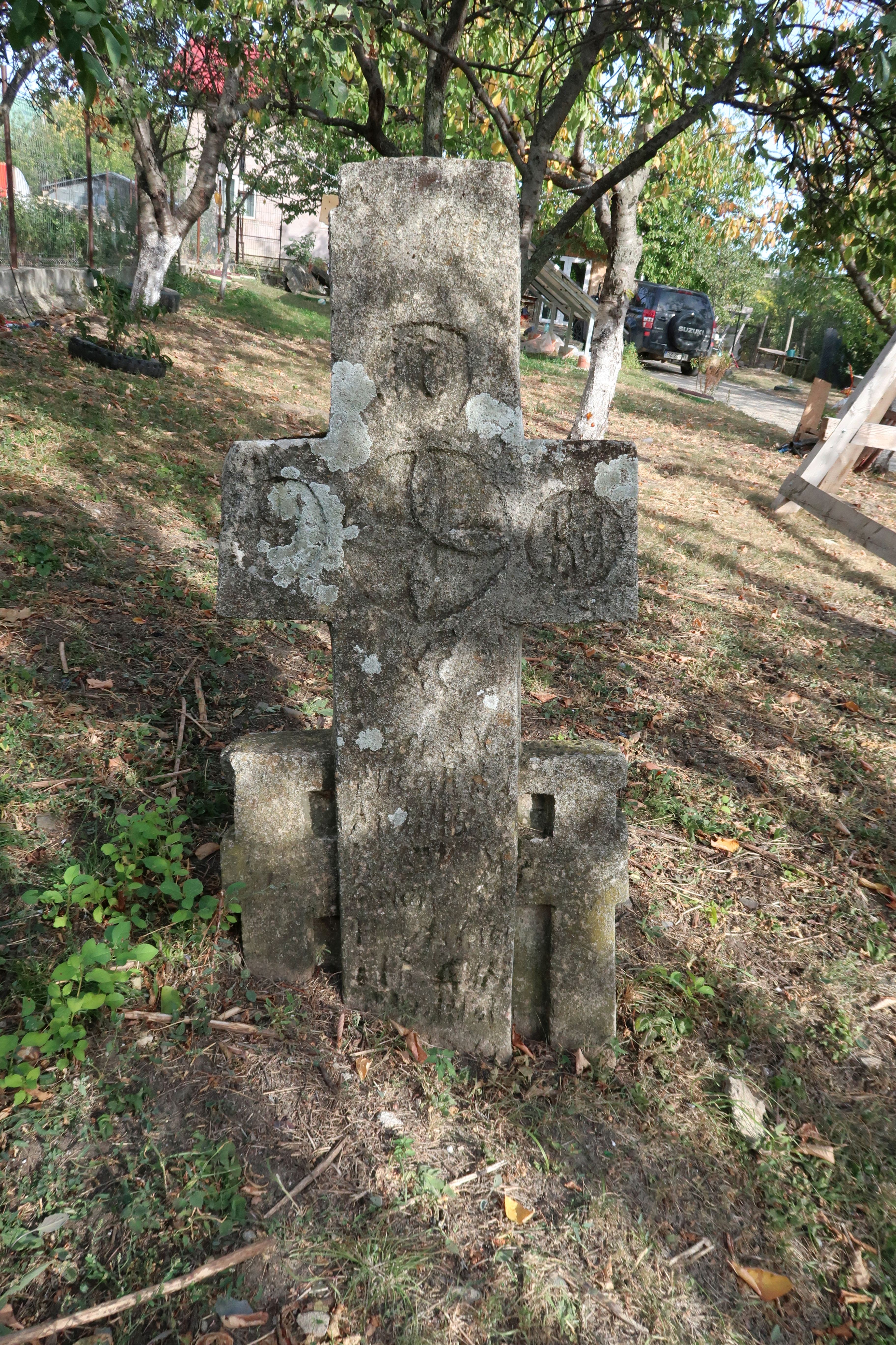 Descriere: Cruce cu pui ce cuprinde crucea-mamă și 2 cruci-pui laterale. Crucea este înclinată pe spate și parțial îngropată. Crucea mare este de tip latin, de dimensiuni mici, fără capitel și cu baza îngropată. Este decorată doar pe față cu patru cinci medalioare, un medalion central, mai mare ce încadrează un motiv floral, și patru medalioane mai mici care-l flanchează pe cel central, cu monogramele IC H KA XC. Pe picior este o inscripție în slavonă aproape ilizibilă, pe 7 rânduri. Restul inscripției până la baza piciorului este îngropat. Crucile-pui sunt de tip latin, de mici dimensiuni, cu capitel. Nu prezintă decor.