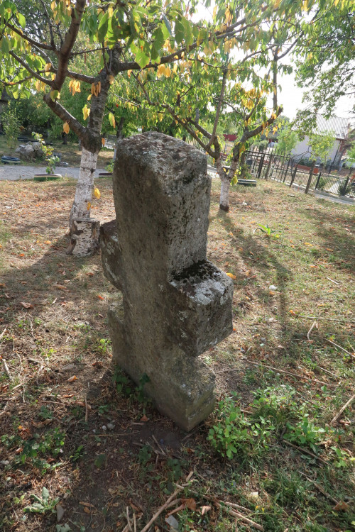 Inscripții: Inscripția frontală de pe piciorul crucii mari este scrisă în slavonă, pe 7 rânduri (observabile, peste nivelul solului).