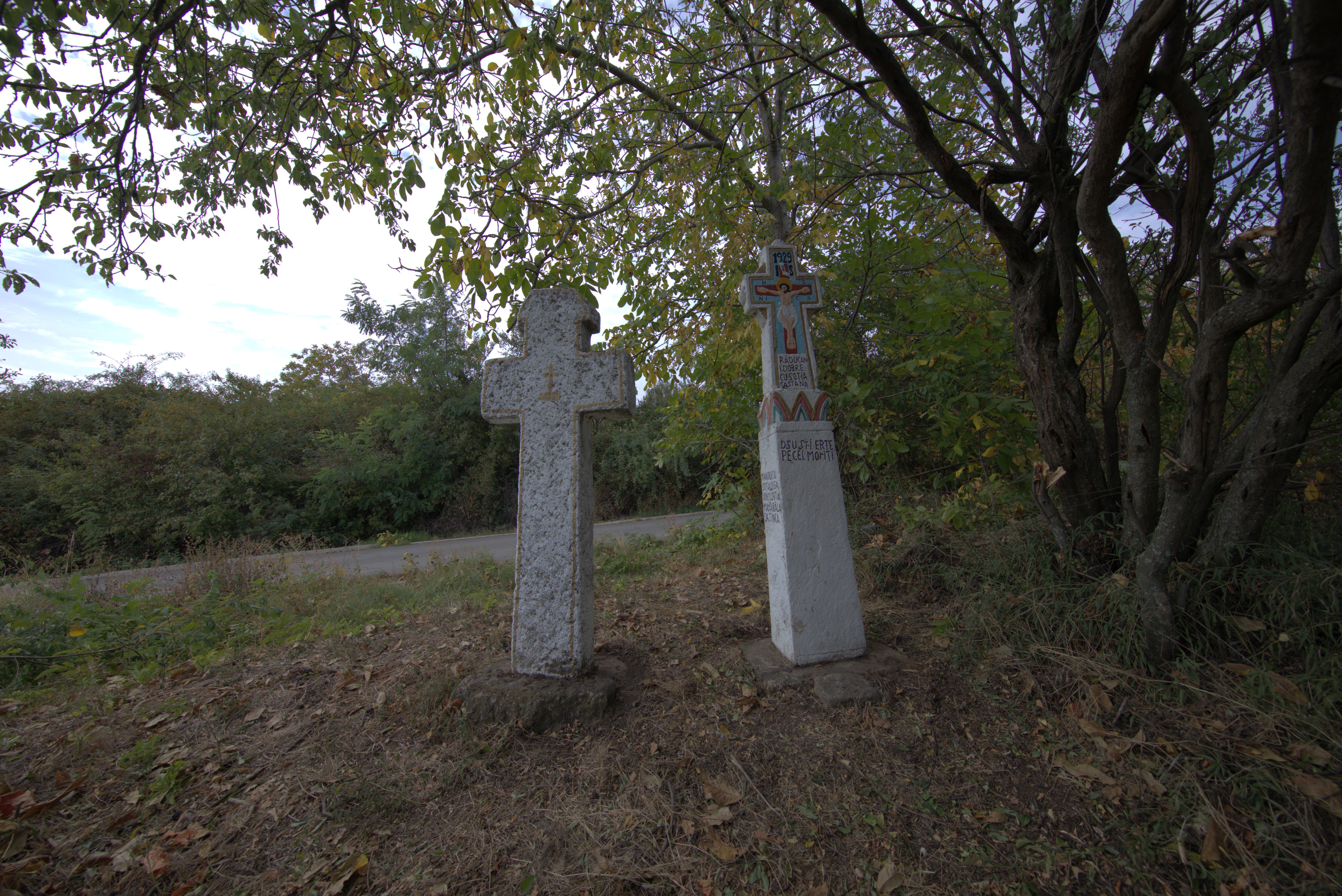 Descriere: Cruce de tip latin, de dimensiuni medii, cu capitel și bază îngropată, realizată din calcar sarmațian. Crucea are o înălțime de 172 de cm și face parte dintr-un ansamblu de două cruci. Capitelul sau căciula este fixă, de mici dimensiuni, având forma de trunchi de piramidă. Lungimea din partea superioară este de 26 de cm iar în partea inferioară este de 39 de cm. Căciula este decorată doar în partea frontală cu o cruce latină cu căciulă și bază sculptată în relief și vopsită într-un galben auriu, precum și marginea căciulii. Decorația centrală este reprezentată de o cruce greacă cu exteriorul vopsit în roșu și interiorul în galben auriu. Crucea greacă este mărginită de monograma hristică IS XC NI KA (Iisus Hristos Biruitor). Marginile crucii este vopsită într-un auriu redând o altă cruce cu unghiurile din partea superioară redând rozete vopsite în roșu și galben auriu. Partea frontală a piciorului prezintă inscripția cu dedicația comanditarilor. Spatele crucii este decorat cu o mică cruce pictată în auriu. Lateralele crucii nu sunt decorate. Crucea este prinsă într-o bază sau piuă îngropată de formă aproape pătrată, cu lungimea de 62 de cm și lățimea de 60.