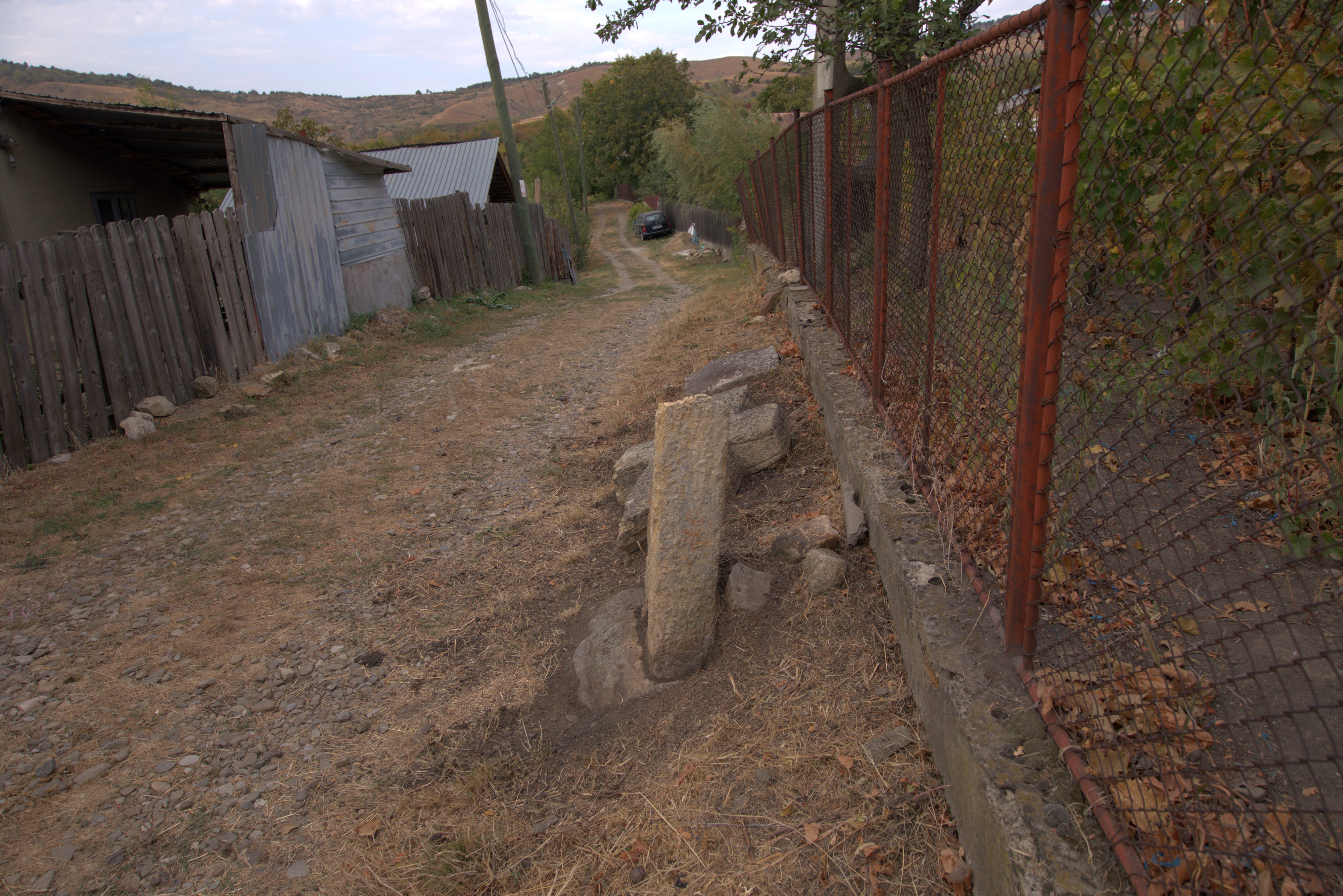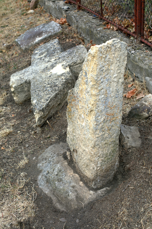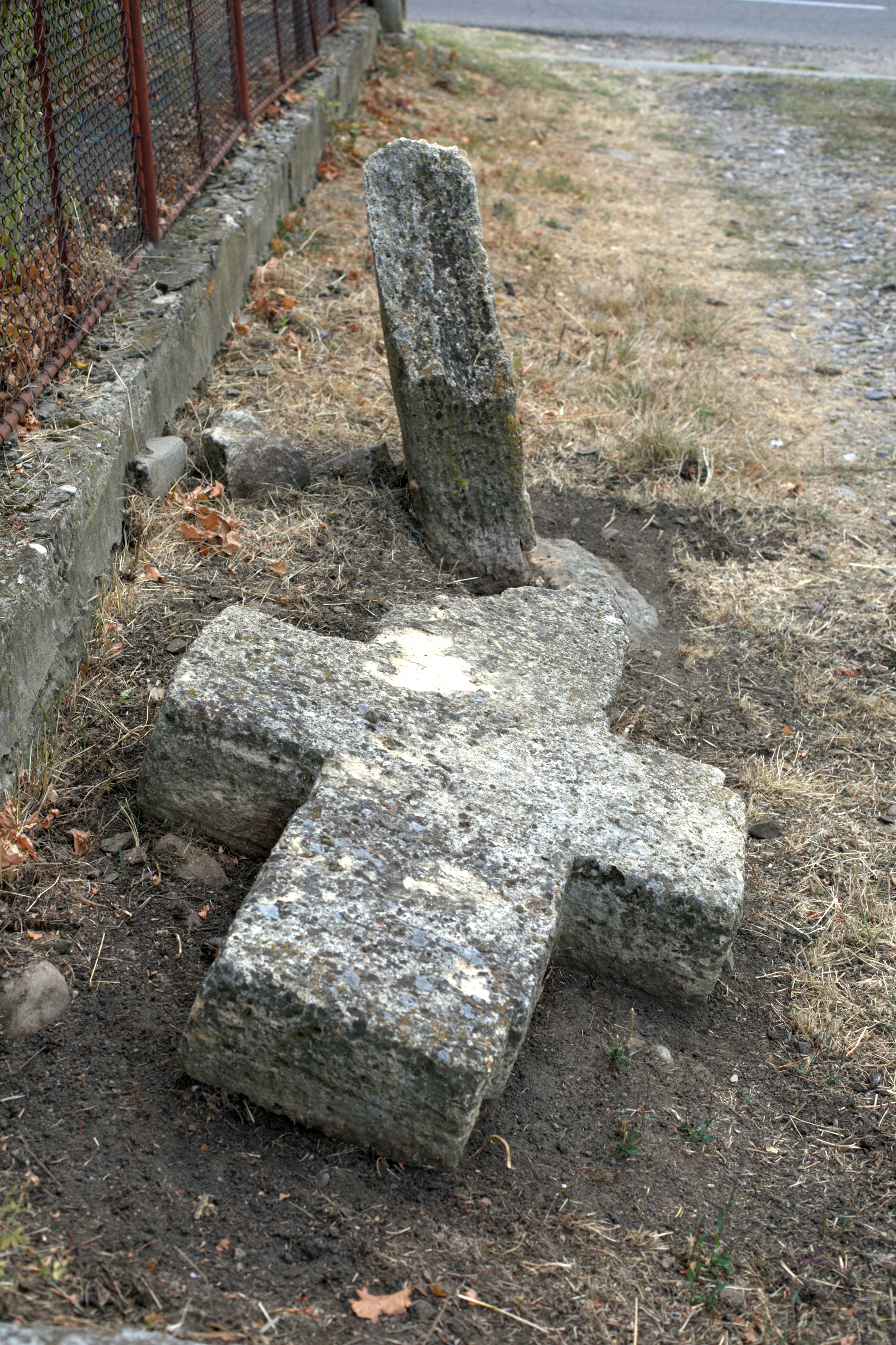 Descriere: Cruce latină simplă, fără căciulă, de dimensiuni medii, cu o înălțime de cca 194 de cm, prinsă într-un postament îngropat. Crucea este ruptă în două în zona piciorului, unde se observă o fisură oblică. Partea superioară a crucii, respectiv capul, brațele și o parte din picior sunt căzute iar partea de jos a piciorului este încă prinsă în postament. Crucea se află într-o stare precară de conservare, inscripțiile sau decorațiile fiind aproape ilizibile. Se mai observă un medalion central și două medalioane pe brațe pe fața crucii precum și urmele unei inscripții frontale ilizibile pe picior. De asemenea se mai observă urmele unei inscripții pe părțile laterale ale piciorului. Postamentul are o formă dreptunghiulară cu o lungime de 70 de cm și o lățime de 60 de cm. Postamentul este îngropat.