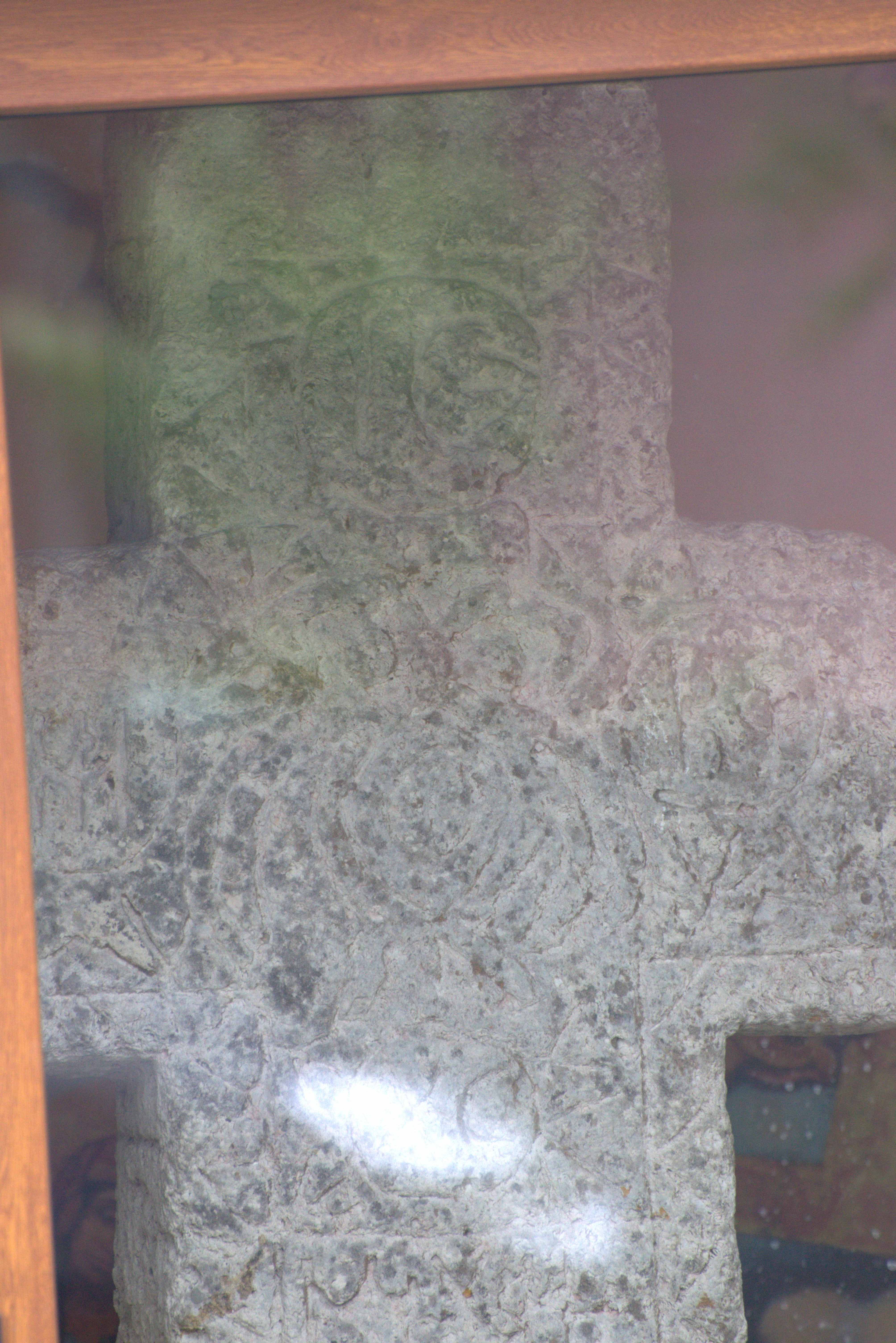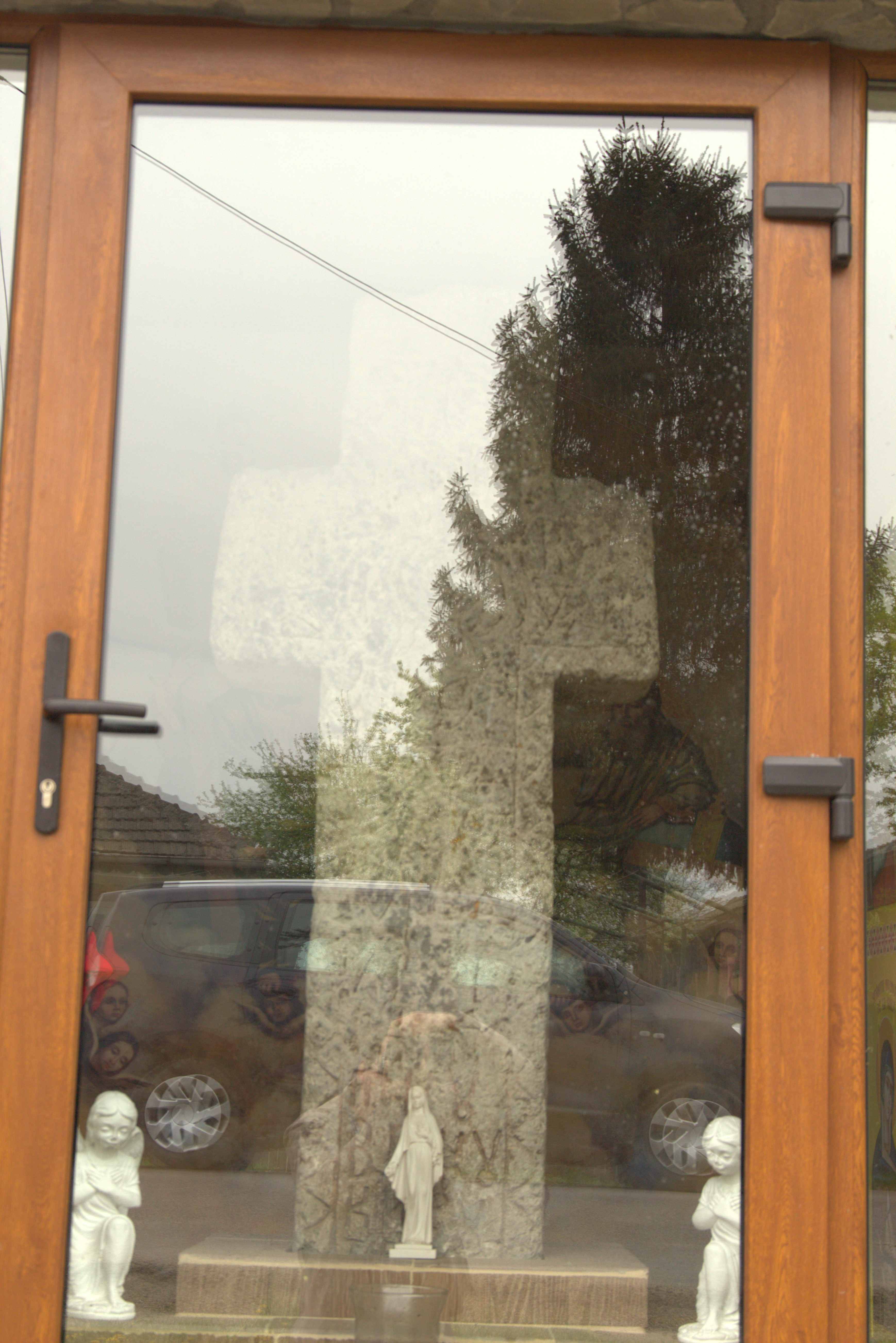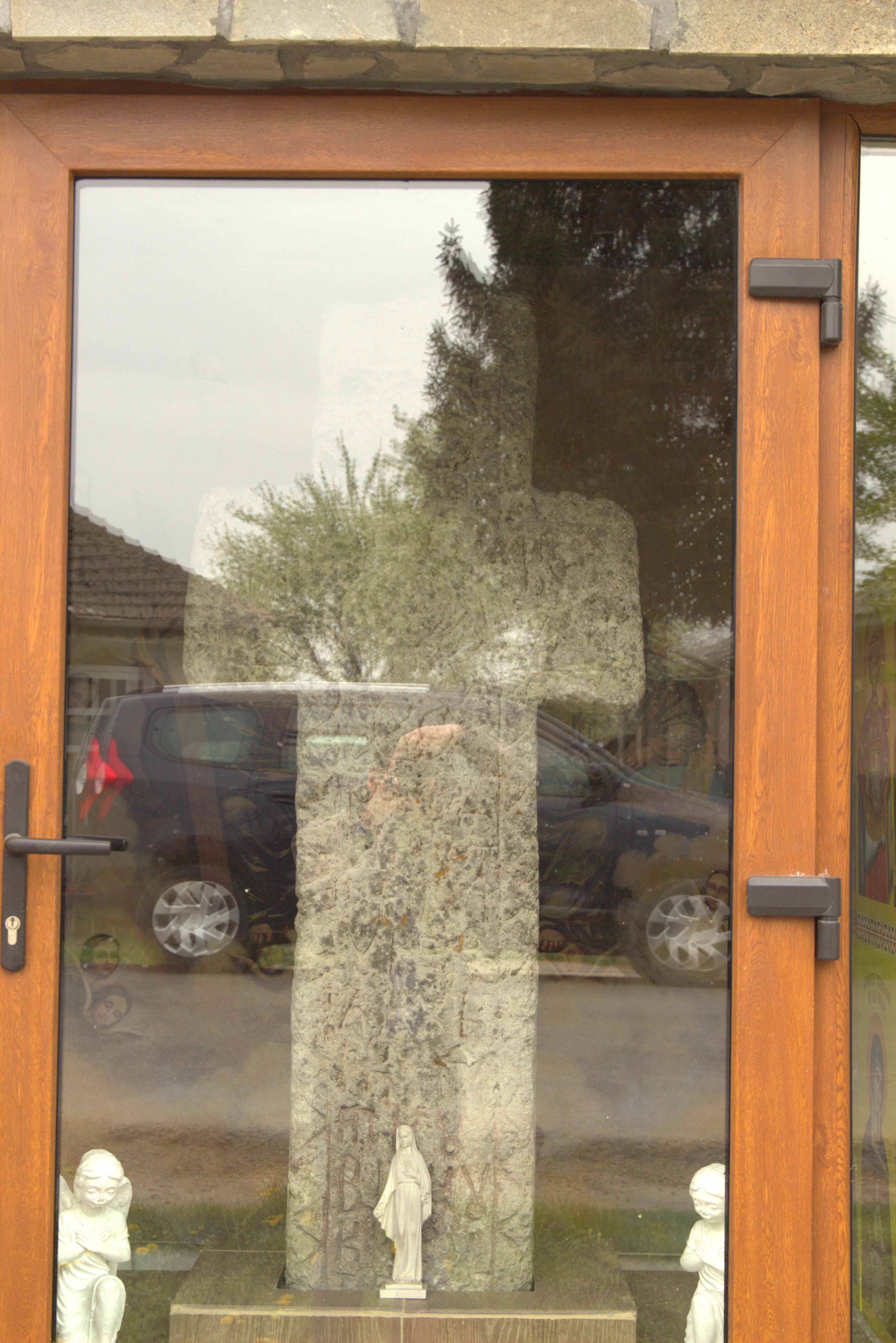 Descriere: Cruce de tip latin. Crucea prezintă urme ale deteriorării, este așezată într-o vitrină de termopan. Nu prezintă capitel, se pot observa la nivelul inferior al piciorului inscripții ilizibile. Suprafața crucii prezintă un model, de asemenea sunt inscripții ilizibile și pe brațul stâng. Pe capul crucii se distinge un medalion cu o abreviere ilizibilă. Brațul drept al crucii prezintă urme de eroziune sau lovire, fapt ce poate sugera că aceasta a căzut și ulterior a fost restaurată. Pe piciorul crucii, pe brațul stâng și pe cap se pot observa inscripții.
