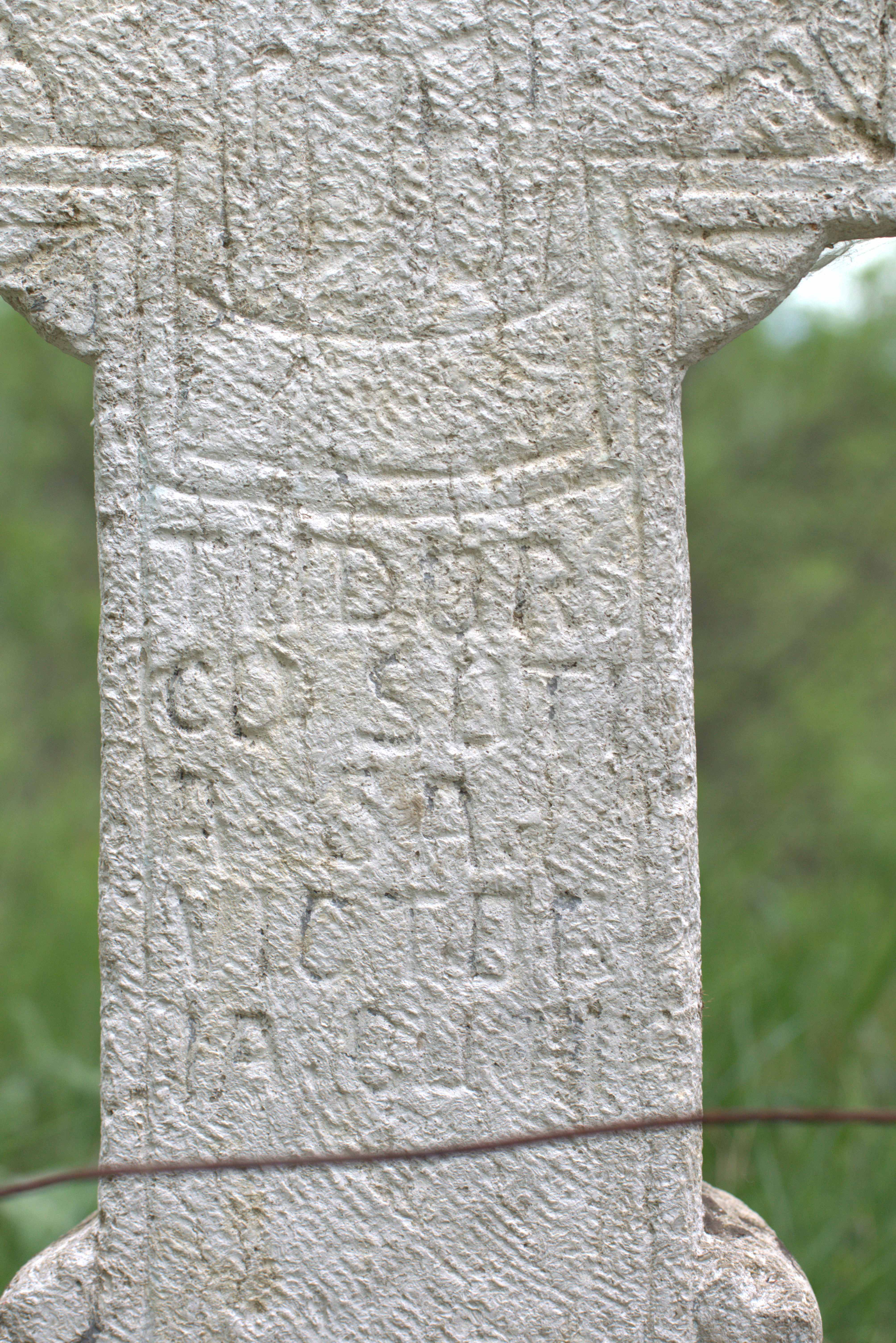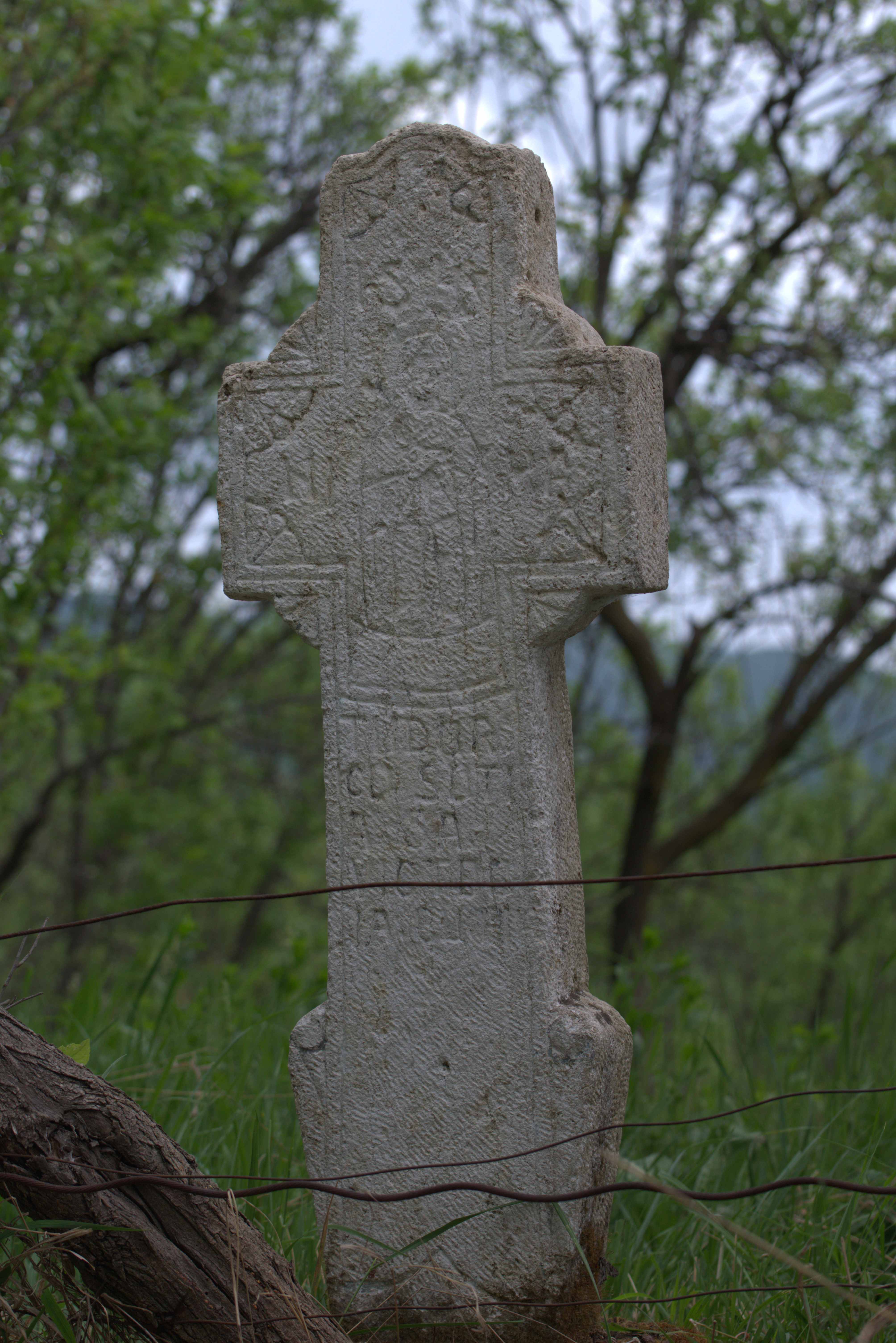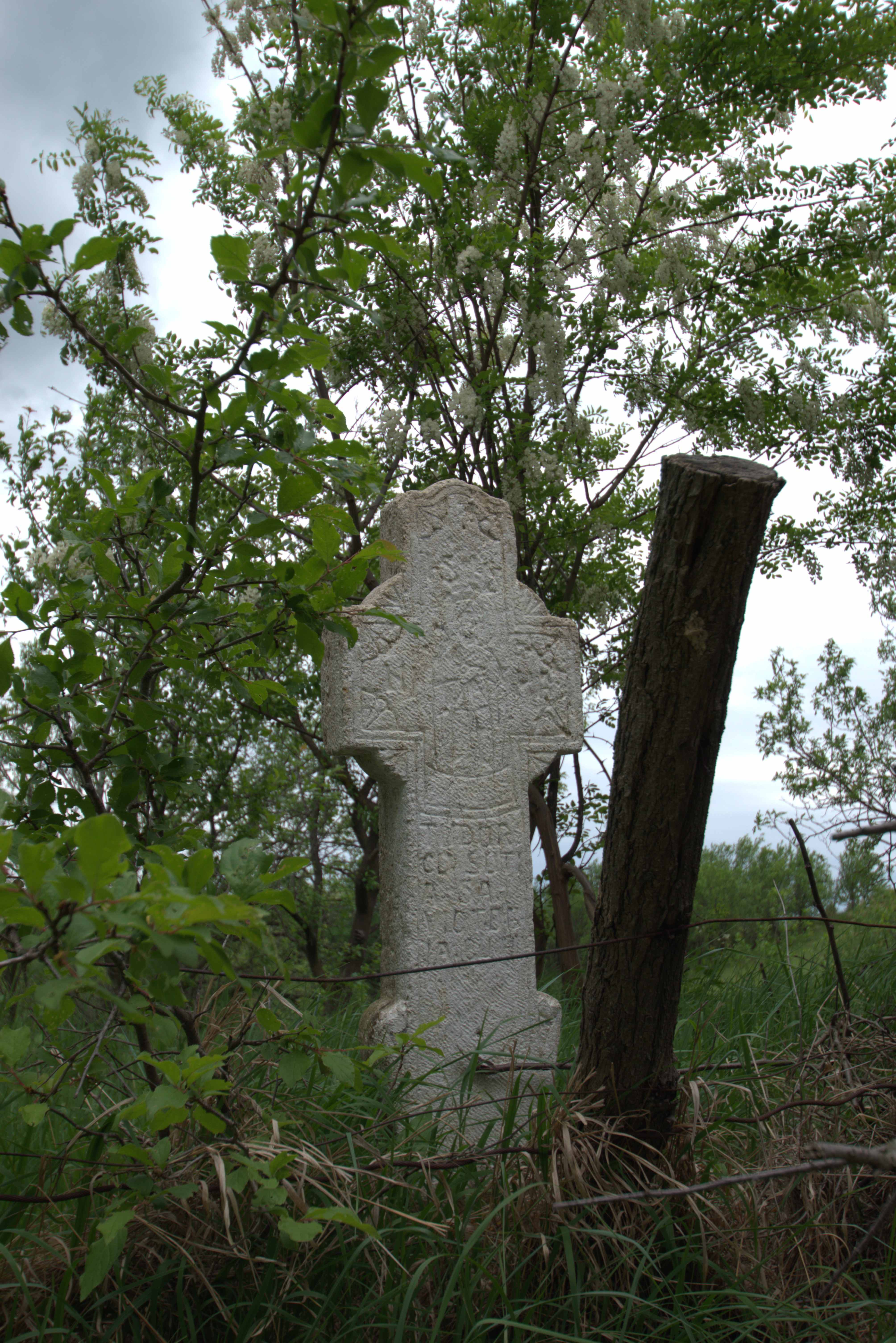 Descriere: Cruce de tip celtic. Inscripții cu caractere latine, fără urme de pictură. Se pot observa urmele uneltelor folosite la cioplit. Are incizată o cruce și în mijlocul ei pe Fecioara Maria cu pruncul (probabil). Are urme de var. Are inscripții pe picior, în față. Stare de conservare: bună.