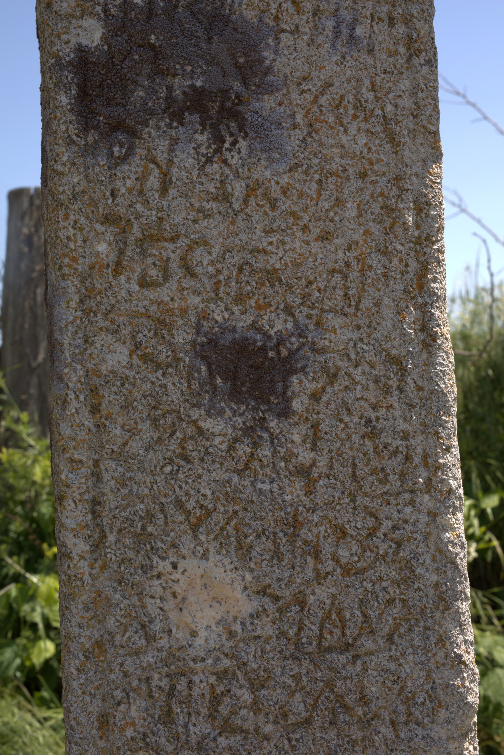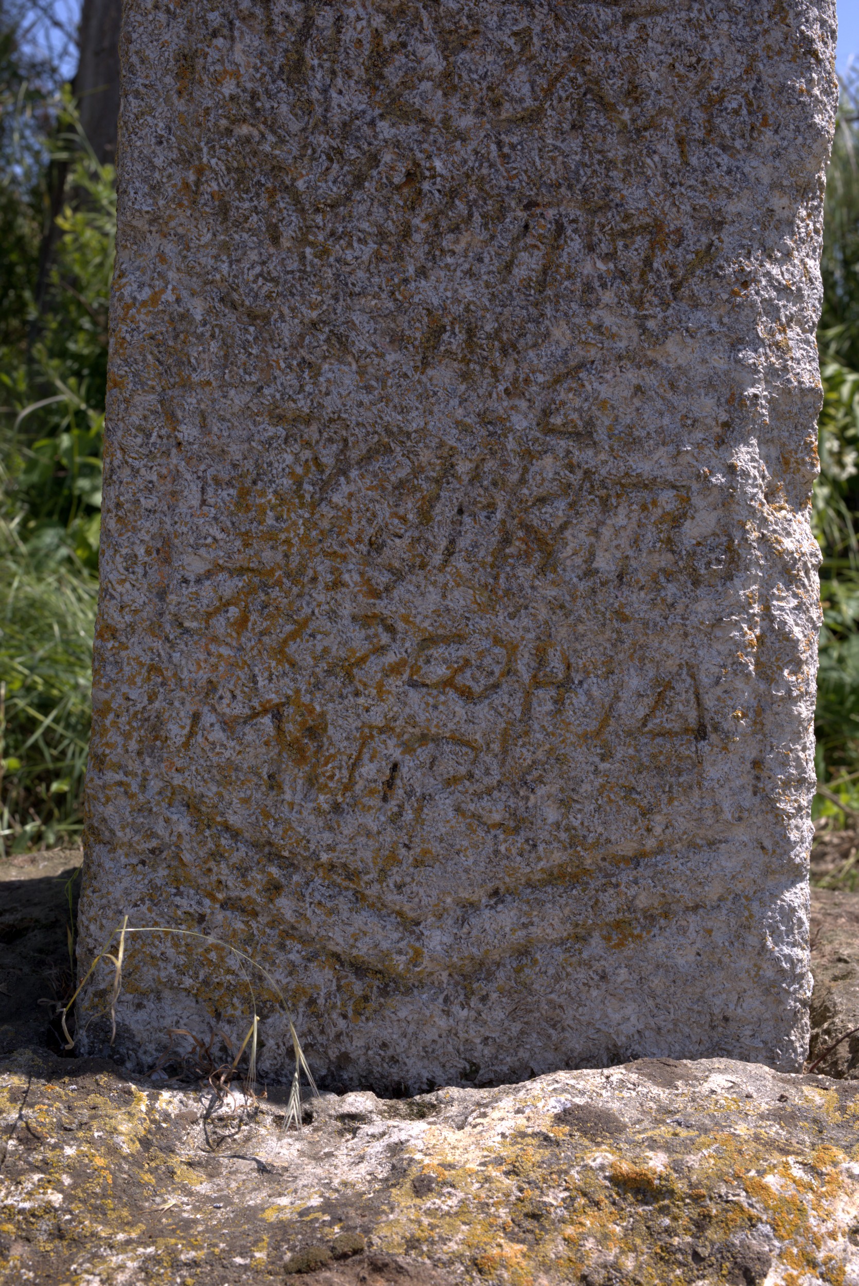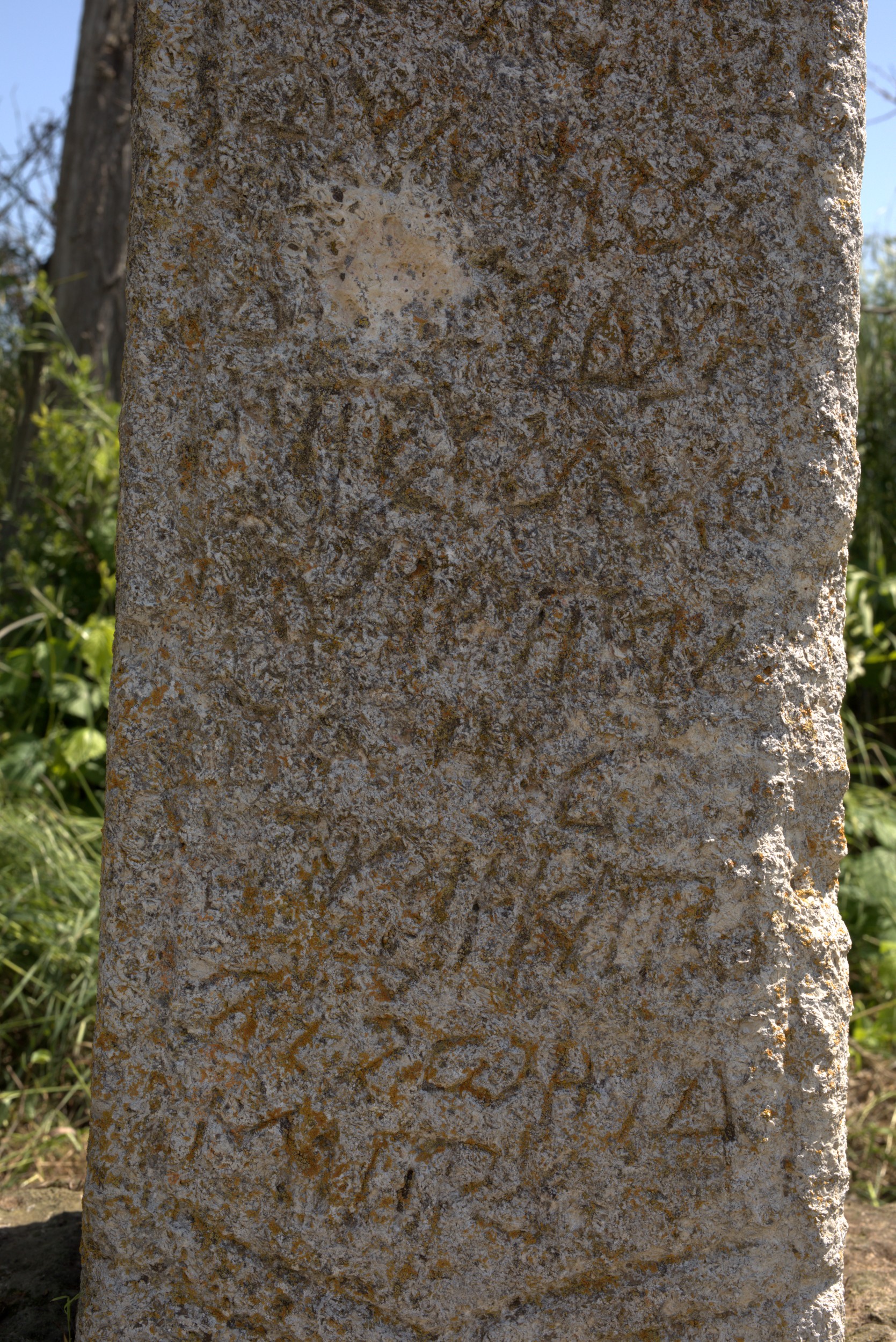 Inscripții: Inscripția de pe picior, din partea frontală este scrisă în limba română cu alfabet chirilic, pe 17 rânduri, cu lungimea de 24 cm (partea de sus) până la 28 de cm în partea de jos și litere cu înălțimea de 5 cm.