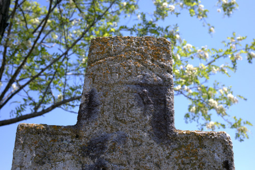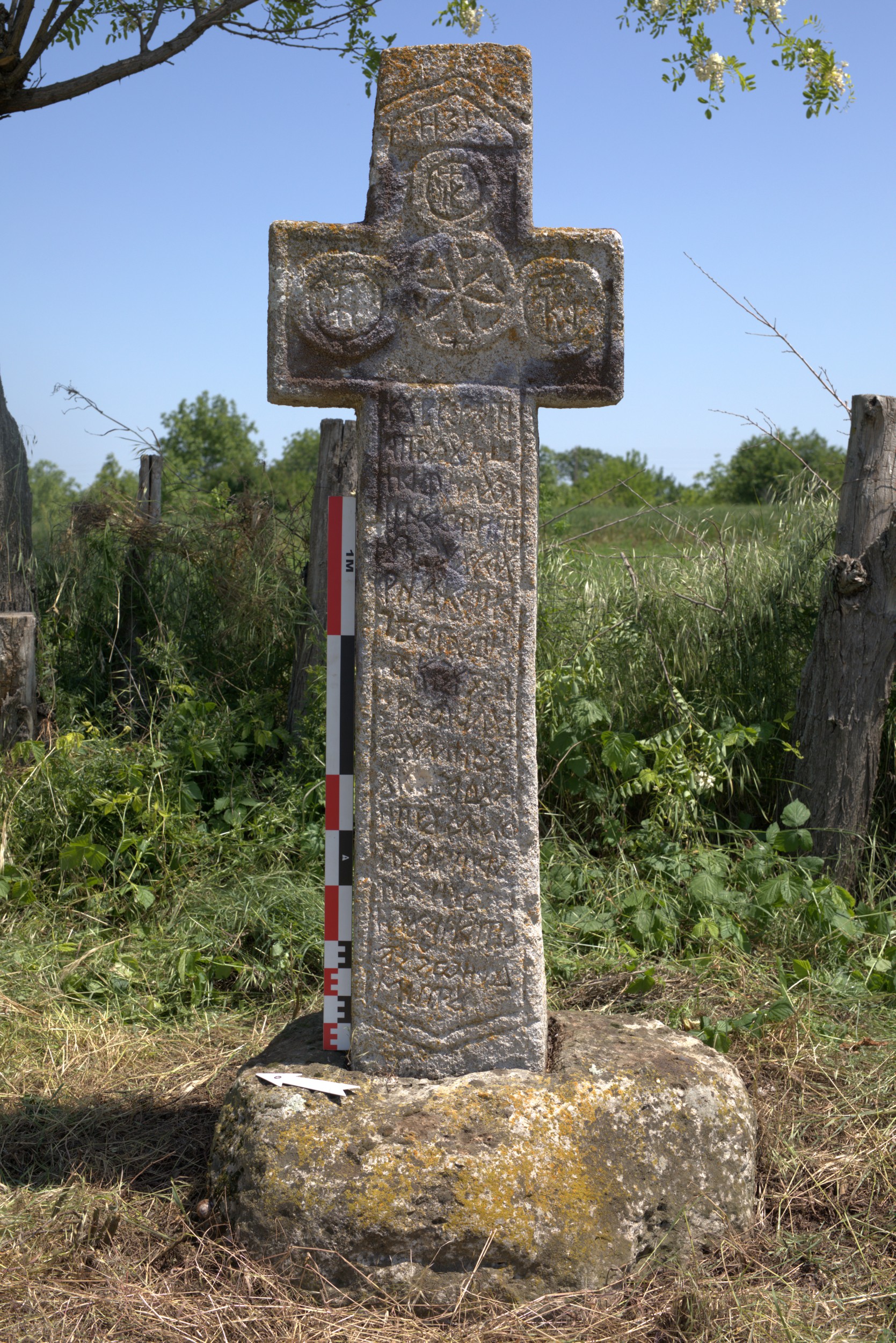 Descriere: Cruce latină, de dimensiuni, relativ mari, fără capitel, prinsă într-o bază dreptunghiulară. Crucea este ornamentată și inscripționată în partea frontală și pe laterale. La jumătatea capului crucii este inscizată o formă geometrică formată din mai multe triunghiuri, reprezentând probabil o căciulă sau un capitel. Triunghiul central încadrează o monogramă scrisă în alfabet chirilic român. Decorația centrală a crucii e reprezentată de patru medalioane. Medalionul din partea superioară încadrează monograma IX. Medalionul este alipit medalionului central, care este puțin mai mare și care încadrează un motiv floral, o rozetă. De medalionul central mai sunt alipite și cele două medalioane laterale, de pe brațe care încadrează monogramele NH, pe brațul drept și KA, pe brațul stâng. Sub medalionul central mai este monograma XC care nu mai este încadrată de un medalion. Pe picior este inscripționată o dedicață scrisă în limba română cu alfabet chirilic, pe 17 rânduri. Mai sunt incripție pe picior, pe partea stângă, un text scrisc pe 14 rânduri și pe picior, pe partea dreaptă, unde este inscripționat un text pe 2 rânduri. Se observă că piciorul se lățește din partea superioară spre bază. Crucea este amplasată pe o piuă sau bază cu laturile neregulate, situată deasupra solului.