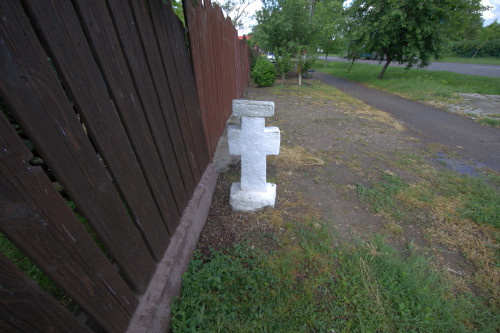 Descriere: Cruce latină, de mici dimensiuni, cu căciulă fixă și prinsă într-un piuă dreptunghiulară, parțial îngropată. Crucea a fostă văruită de nenumărate ori iar acest lucru a afectat ornamentele și inscripția de pe cruce, acum total ilizibile. Capitelul este dreptunghiular și în partea frontală este posibil să aibă sculptat anul ctitoririi. Este posibil să fi fost decorată în partea frontală.