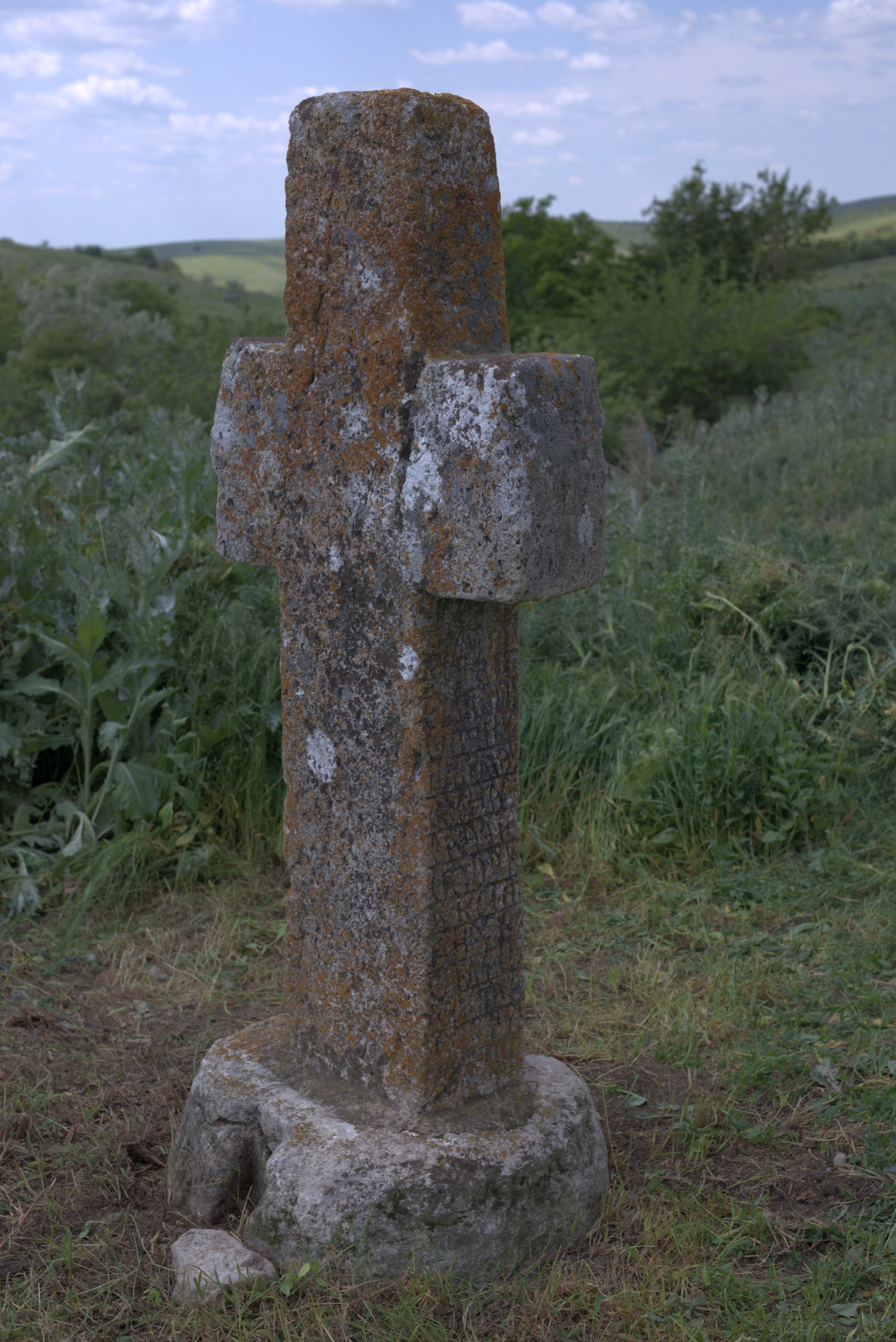 Descriere: Cruce latină de dimensiuni medii spre mici, fără capitel, prinsă într-un soclu de mici dimensiuni, dispus pe sol. Decorația frontală este afectată de mușchi și licheni fiind aproape ilizibilă. Cuprinde patru medalioane. Un medalion se află pe capul crucii și încadreaza monograma IC. Medalionul central este mai mare comparativ cu cele trei și încadrează un motiv floral sau o rozetă. Pe brațul drept medalionul încadrează monograma ИH (NI) iar pe brațul stâng este un medalion ce încadrează monograma KA (CA). Pe picior este monograma XS care de această dată nu mai este încadrată de un medalion. Pe picior este inscripționată apoi o dedicație scrisă în limba română cu alfabet chirilic. Și pe laterale prezintă inscripții, respectiv în partea stângă, prezină urmele unei inscripții șterse pe muchia brațului stâng, precum și pe picior, precum și pe picior, pe partea dreaptă. Inscripțiile sunt scrise în limba română cu alfabet chirilic iar rândurile sunt marcate prin linii orizontale incizate. Pe spatele crucii nu se văd urme de decor sau de inscripții. Crucea este prinsă întru soclu relativ rotund, care prezintă două cavițăți de prindere, unul în spate și altul în față. Crucea pare să fi fost prinsă în acest soclu cu ciment în anul 1960.