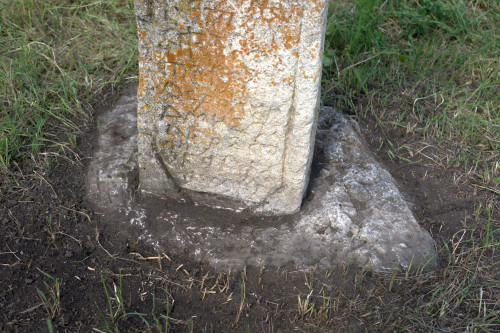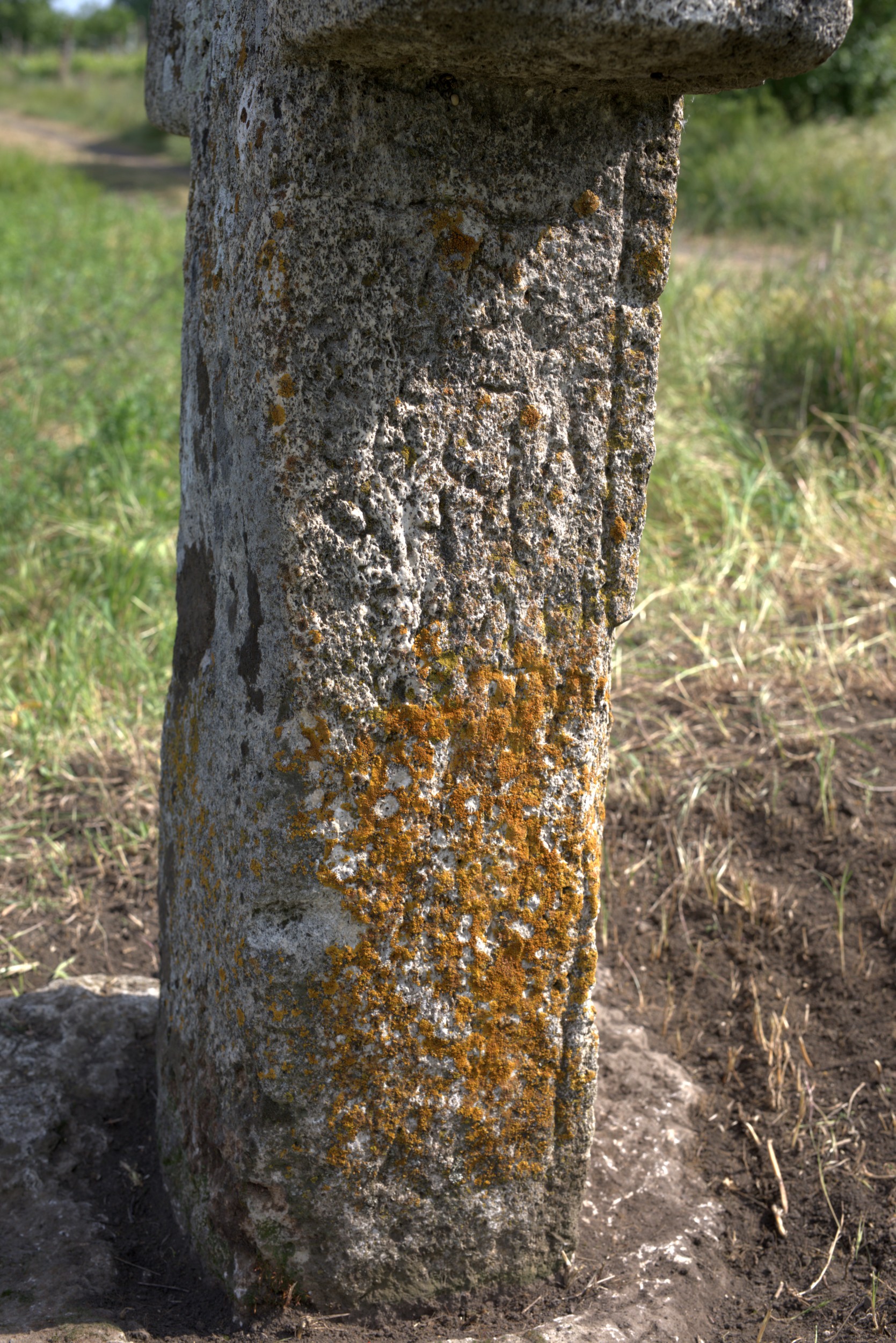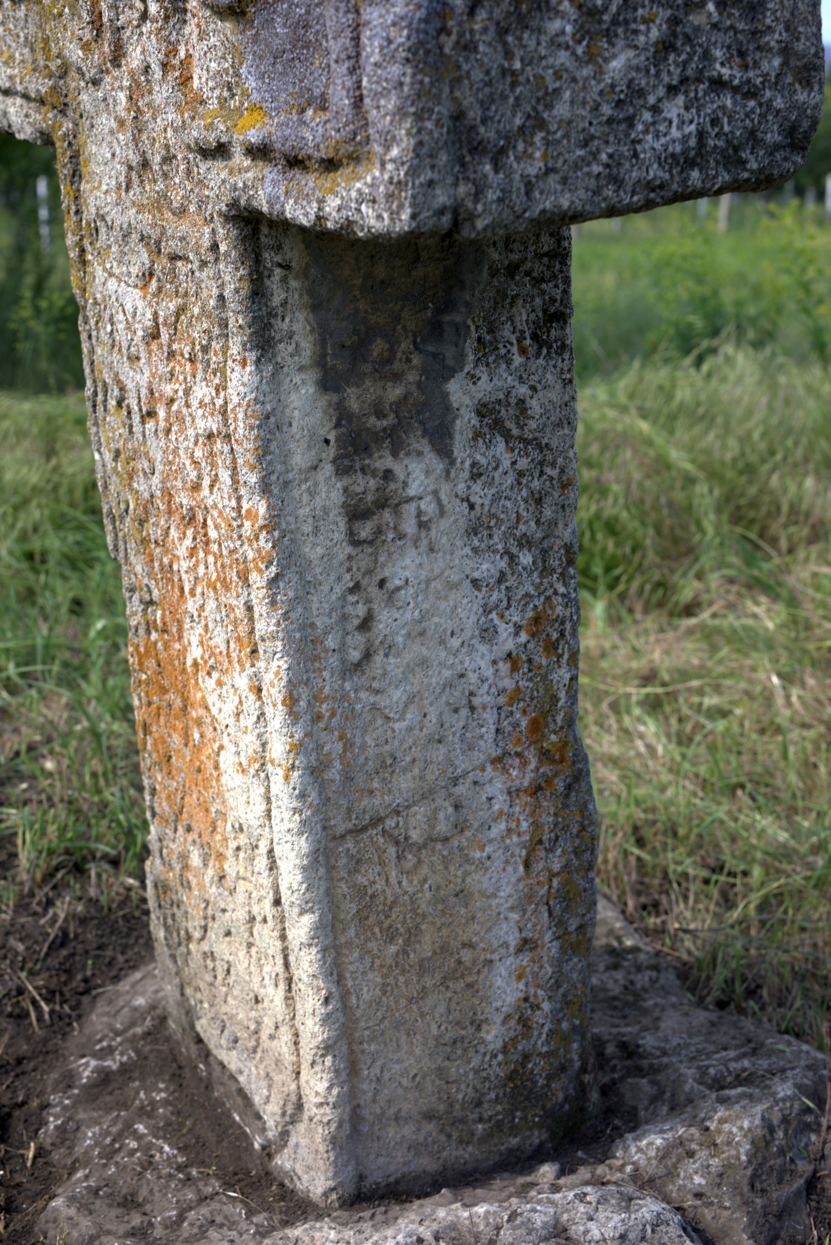 Pe muchia brațului stâng este o inscripție în limba română cu alfabet de tranziție, pe 3 rânduri, cu lungimea de 19 de cm și litere cu înălțimea de 3 cm. Pe piciorul crucii, pe fața lateral stângă este scrisă în limba română cu alfabet de tranziție, pe 5 rânduri, cu lungimea de 14 de cm și litere cu înălțimea de 3 cm.