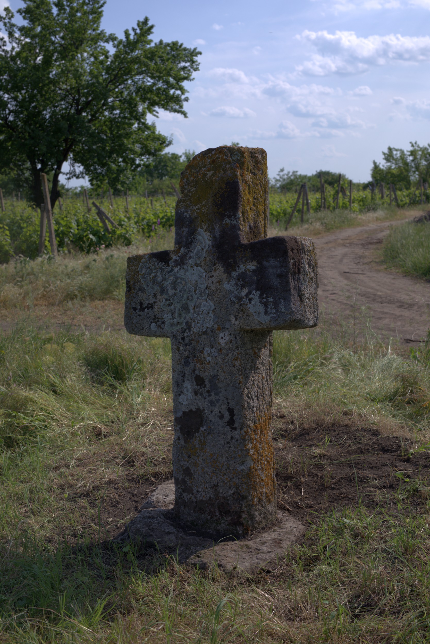 Descriere: Cruce latină, de dimensiuni medii, fără capitel prinsă într-un soclu (piuă) îngropată. În partea frontală este decorată cu patru medalioane dispuse pe cap, be brațe și la intersecția brațelor precum și o inscripție dispusă pe picior. Pe cap este un medalion ce încadrează monograma IC. Pe brațul drept este o monogramă ce încadrează monograma NI iar pe brațul stâng este un medalion ce încadrează monograma KA. Medalionul central este de mai mari dimensiuni și încadrează o rozetă sau un simbol solar. Inscripția de pe picior este scrisă în limba română cu alfabet de tranziție. Pe fața laterală, în partea stângă, crucea este inscripționată pe muchia brațului și pe picior. De asemenea, mai este inscripționată și fața lateral dreapta a crucii, pe muchia brațului și pe picior. Spatele crucii nu prezintă decor sau inscripție.